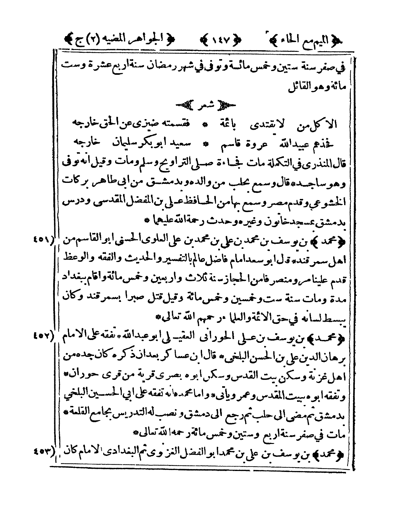 452 - مُحَمَّد بن يُوسُف بن عَليّ الحوراني الْعقيلِيّ أَبُو عبد الله تفقه على الإِمَام برهَان الدّين عَليّ بن الْحسن الْبَلْخِي قَالَ ابْن عَسَاكِر بعد أَن ذكره كَانَ جده من أهل غزنة وَسكن بَيت الْمُقَدّس وَسكن أَبوهُ بصرى قَرْيَة من قرى حوران وتفقه أَبوهُ بِبَيْت الْمُقَدّس وَعَمْرو يَأْتِي وَأما مُحَمَّد فَإِنَّهُ تفقه على أبي الْحُسَيْن الْبَلْخِي بِدِمَشْق ثمَّ مضى إِلَى حلب ثمَّ رَجَعَ إِلَى دمشق نصب لَهُ التدريس بِجَامِع القلعة مَاتَ فى صفر سنة أَربع وَسِتِّينَ وَخمْس مائَة رَحمَه الله تَعَالَى