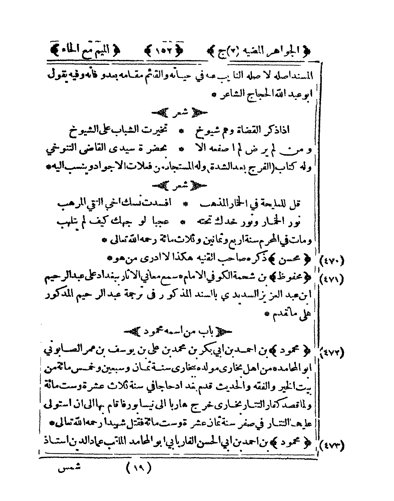 472 - مَحْمُود بن أَحْمد بن أبي بكر بن مُحَمَّد بن عَليّ بن يُوسُف بن عمر الصَّابُونِي أَبُو المحامد من أهل بُخَارى مولده ببخارى سنة ثَمَان وَسبعين وَخمْس مائَة من بَيت الْخَيْر وَالْفِقْه والْحَدِيث قدم بَغْدَاد حَاجا فى سنة ثَلَاث عشرَة وست مائَة وَلما قصد كفار التتار بُخَارى خرج هَارِبا إِلَى نيسابور فَأَقَامَ بهَا إِلَى أَن استولى عَلَيْهَا التتار فى صفر سنة ثَمَان عشرَة وست مائَة فَقتل شَهِيدا رَحمَه الله تَعَالَى
