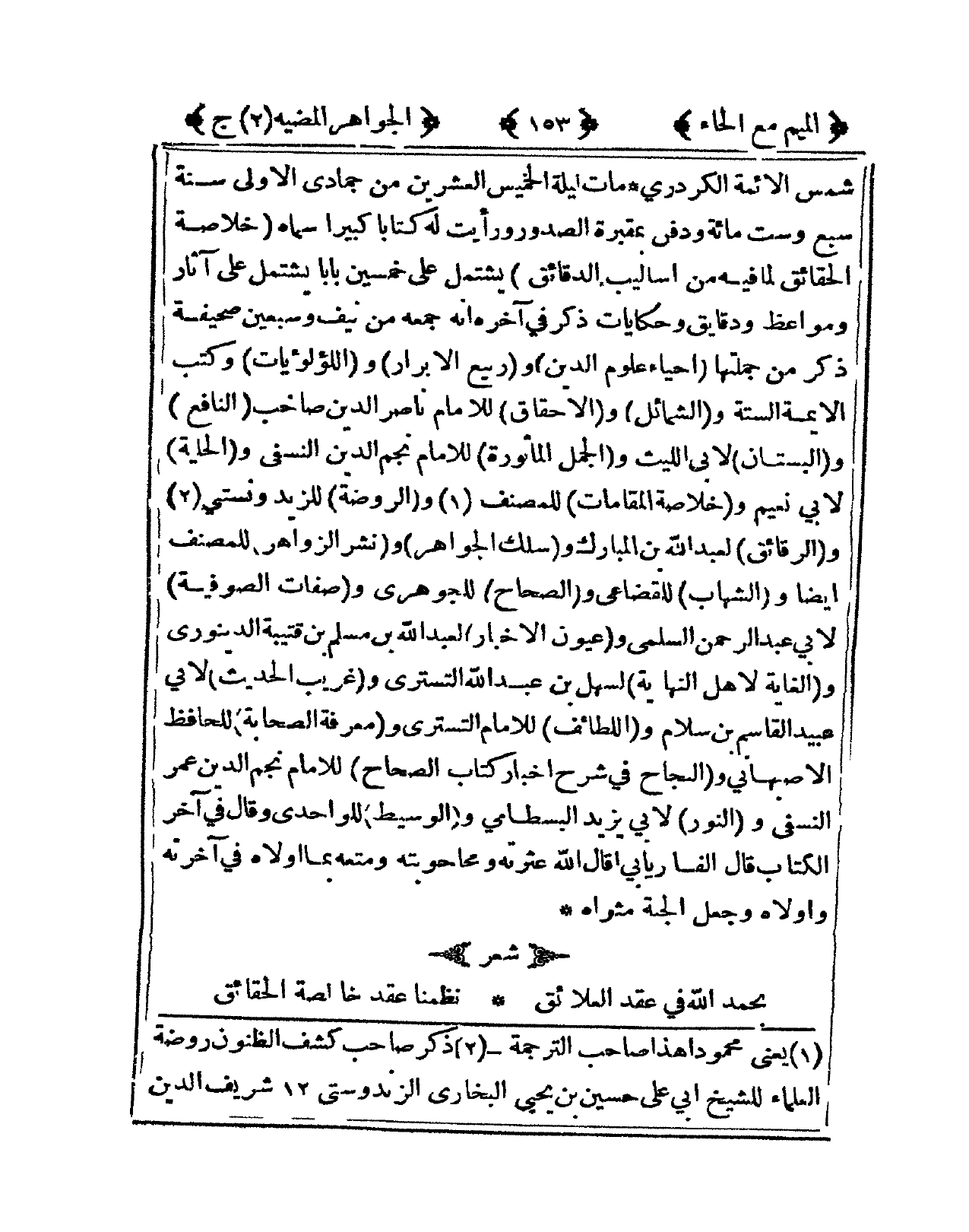 شمس الْأَئِمَّة الكردري وَمَات لَيْلَة الْخَمِيس الْعشْرين من جمادي الأولى سنة سبع وست مائَة وَدفن بمقبرة الصُّدُور وَرَأَيْت لَهُ كتابا كَبِيرا سَمَّاهُ خُلَاصَة الْحَقَائِق لما فِيهِ من أساليب الدقائق يشْتَمل على خمسين بَابا يشْتَمل على آثَار ومواعظ ودقايق وحكايات ذكر فى آخِره أَنه جمعه من نَيف وَسبعين صحيفَة ذكر من جُمْلَتهَا أَحيَاء عُلُوم الدّين وربيع الْأَبْرَار واللؤلؤيات وَكتب الْأَئِمَّة السِّتَّة وَالشَّمَائِل والأحقاق للْإِمَام نَاصِر الدّين صَاحب النافع والبستان لأبي اللَّيْث والجمل المأثورة للْإِمَام نجم الدّين النَّسَفِيّ والحلية لأبي نعيم وخلاصة المقامات للْمُصَنف وَالرَّوْضَة للزيد ونستي وَالرَّقَائِق لعبد الله بن الْمُبَارك وسلك الْجَوَاهِر وَنشر الزواهر للْمُصَنف أَيْضا والشهاب للقضاعي والصحاح للجوهري وصفات الصُّوفِيَّة لأبي عبد الرَّحْمَن السّلمِيّ وعيون الْأَخْبَار لعبد الله بن مُسلم بن قُتَيْبَة الدينَوَرِي والغاية لأهل النِّهَايَة لسهل بن عبد الله التسترِي وغريب الحَدِيث لأبي عبيد الْقَاسِم بن سَلام واللطائف للْإِمَام التسترِي وَمَعْرِفَة الصَّحَابَة لِلْحَافِظِ الْأَصْبَهَانِيّ والنجاح فى شرح أَخْبَار كتاب الصِّحَاح للْإِمَام نجم الدّين عمر النَّسَفِيّ والنور لأبي يزِيد البسطامي والوسيط لِلْوَاحِدِيِّ وَقَالَ فى آخر الْكتاب قَالَ الفاريابي أقَال الله عثرته ومحا حوبته ومتعه بِمَا أولاه فى آخرته وأولاه وَجعل الْجنَّة مثواه شعر ... بِحَمْد الله فى عقد العلائق ... نظمنا عقد خَالِصَة الْحَقَائِق ...