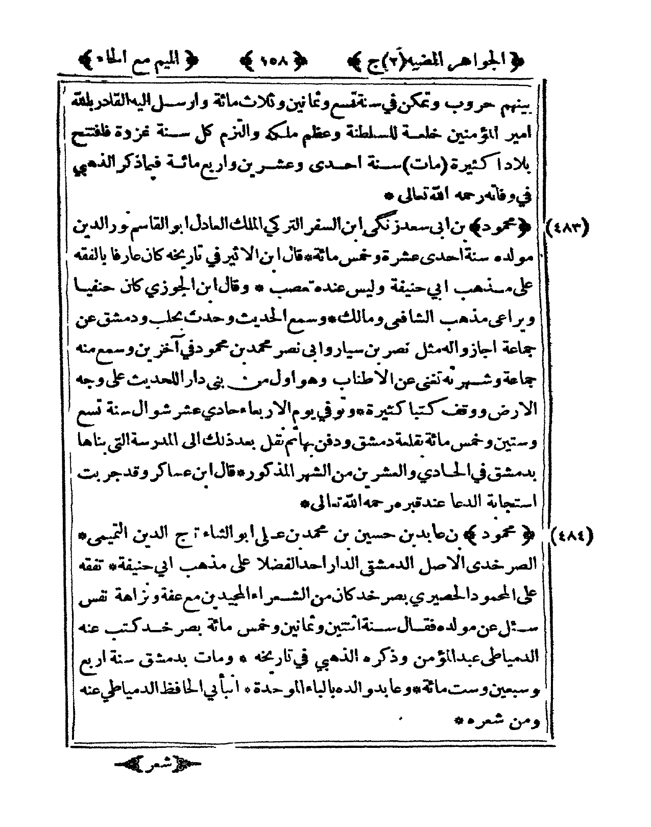 483 - مَحْمُود بن أبي سعد زنكي ابْن السّفر التركي الْملك الْعَادِل أَبُو الْقَاسِم نور الدّين مولده سنة إِحْدَى عشرَة وَخمْس مائَة قَالَ ابْن الْأَثِير فى تَارِيخه كَانَ عَارِفًا بالفقه على مَذْهَب أبي حنيفَة وَلَيْسَ عِنْده تعصب وَقَالَ ابْن الْجَوْزِيّ كَانَ حنفيا ويراعي مَذْهَب الشَّافِعِي وَمَالك وَسمع الحَدِيث وَحدث بحلب ودمشق عَن جمَاعَة أَجَازُوا لَهُ مثل نصر بن سيار وَأبي نصر مُحَمَّد بن مَحْمُود فى آخَرين وَسمع مِنْهُ جمَاعَة وشهرته تغني عَن الْأَطْنَاب وهوأول من بنى دَار للْحَدِيث على وَجه الأَرْض ووقف كتبا كَثِيرَة وَتُوفِّي يَوْم الْأَرْبَعَاء حادي عشر شَوَّال سنة تسع وَسِتِّينَ وَخمْس مائَة بقلعة دمشق وَدفن بهَا ثمَّ نقل بعد ذَلِك إِلَى الْمدرسَة الَّتِى بناها بِدِمَشْق فى الْحَادِي وَالْعِشْرين من الشَّهْر الْمَذْكُور قَالَ ابْن عَسَاكِر وَقد جربت استجابة الدعا عِنْد قَبره رَحمَه الله تَعَالَى