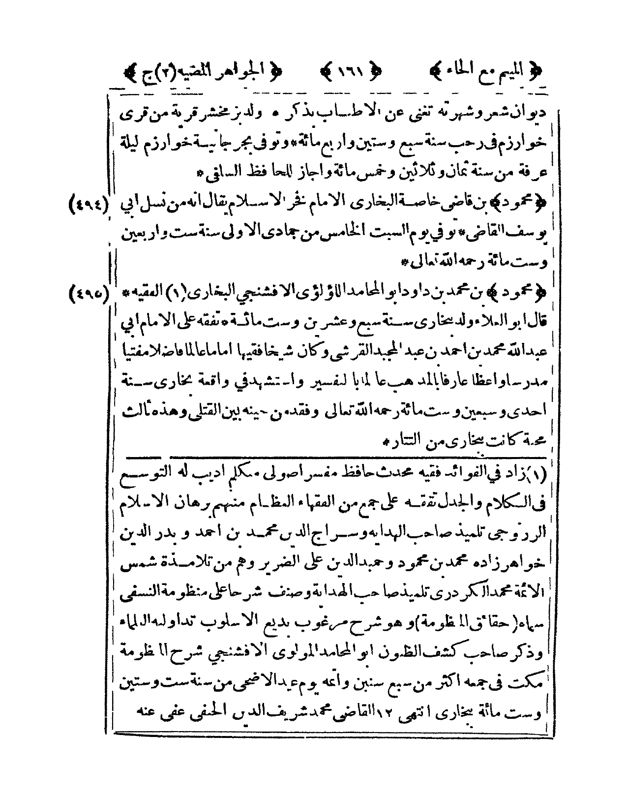 494 - مَحْمُود بن قَاضِي خَاصَّة البخارى الإِمَام فَخر الْإِسْلَام يُقَال إِنَّه من نسل أبي يُوسُف القَاضِي توفّي يَوْم السبت الْخَامِس من جمادي الأولى سنة سِتّ وَأَرْبَعين وست مائَة رَحمَه الله تَعَالَى