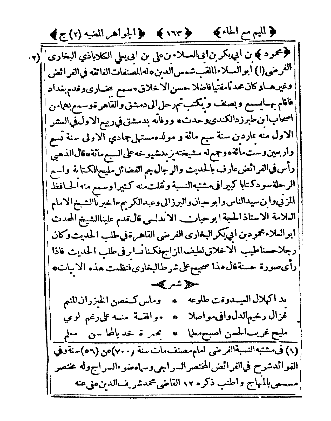 502 - مَحْمُود بن أبي بكر بن أبي الْعَلَاء بن عَليّ بن أبي يعلي الكلاباذي البُخَارِيّ الفرضي أَبُو الْعَلَاء الملقب شمس الدّين لَهُ المصنفات الفائقة فى الْفَرَائِض وَغَيرهَا وَكَانَ مُحدثا مفتيا فَاضلا حسن الْأَخْلَاق سمع ببخارى وَقدم بَغْدَاد فَأَقَامَ بهَا يسمع ويصنف وَيكْتب ثمَّ رَحل إِلَى دمشق والقاهرة وَسمع بهما من أَصْحَاب ابْن طبرزد الْكِنْدِيّ وَحدث ووفاته بِدِمَشْق فى ربيع الأول فى الْعشْر الأول مِنْهُ بماردين سنة سبع مائَة ومولده مستهل جمادي الأولى سنة تسع وَأَرْبَعين وست مائَة وَجمع لَهُ مشيخته يزِيد شُيُوخه على السَّبع مائَة قَالَ الذَّهَبِيّ رَأس فى الْفَرَائِض عَارِف بِالْحَدِيثِ وَالرِّجَال جم الْفَضَائِل مليح الْكِتَابَة وَاسع الرحلة سود كتابا كَبِيرا فى مشتبه النِّسْبَة ونقلت مِنْهُ كثيرا وَسمع مِنْهُ الْحَافِظ الْمُزنِيّ وَابْن سيد النَّاس وأبوحيان والبرزالي وَعبد الْكَرِيم أخبرنَا الشَّيْخ الإِمَام الْعَلامَة الْأُسْتَاذ الْحجَّة أَبُو حَيَّان الأندلسي قَالَ قدم علينا الشَّيْخ الْمُحدث أَبُو الْعَلَاء مَحْمُود بن أبي بكر البُخَارِيّ الفرضي الْقَاهِرَة فى طلب الحَدِيث وَكَانَ رجلا حسنا طيب الْأَخْلَاق لطيف المزاج فَكُنَّا نساير فى طلب الحَدِيث فَإِذا رأى صُورَة حَسَنَة قَالَ هَذَا صَحِيح على شَرط البُخَارِيّ فنظمت هَذِه الأبيات شعر ... بدا كهلال الْعِيد وَقت طلوعه ... وملس كغصن الخيزران الْمُنعم