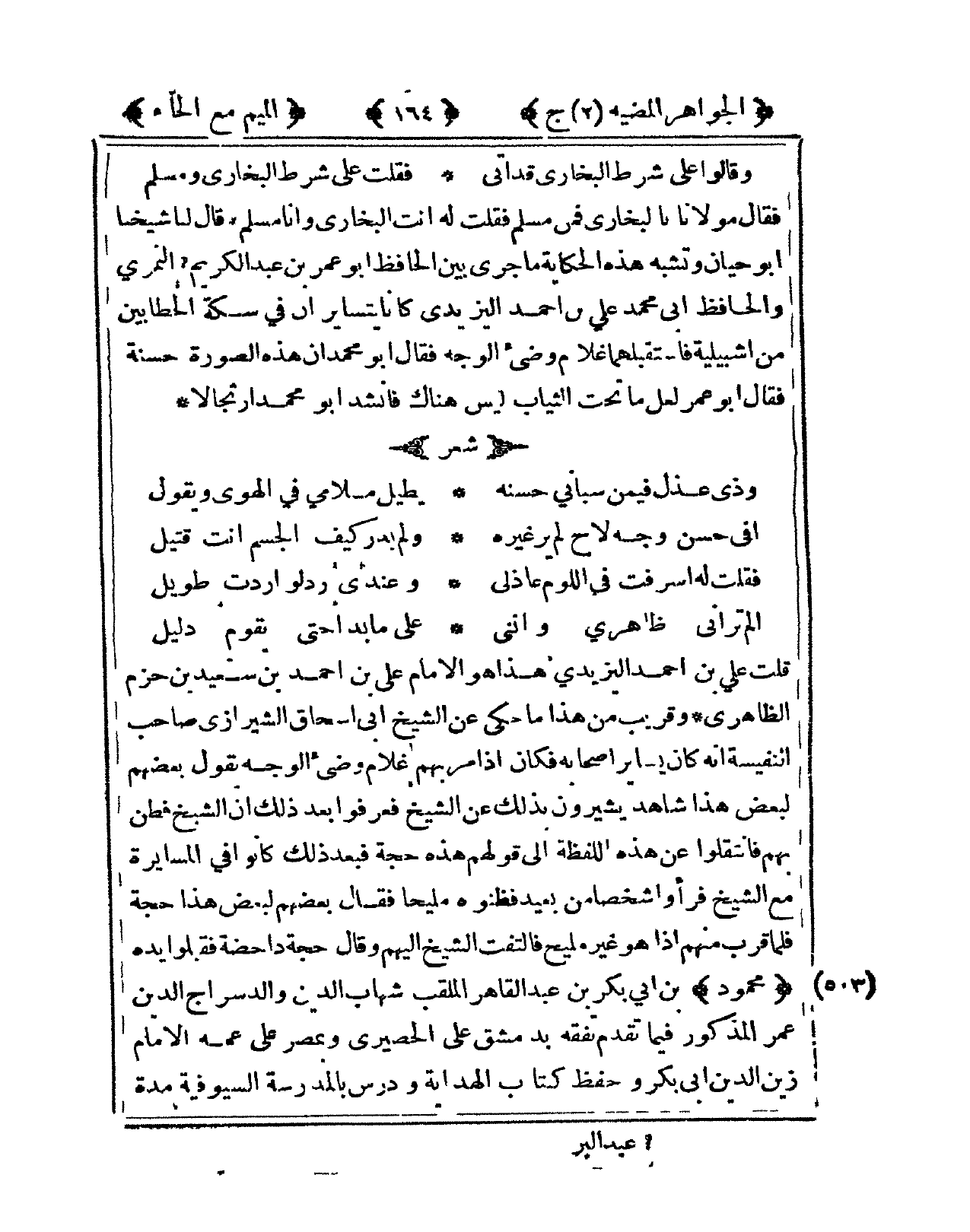 فَقَالَ مَوْلَانَا البُخَارِيّ فَمن مُسلم فَقلت لَهُ أَنْت البُخَارِيّ وَأَنا مُسلم فَقَالَ لنا شَيخنَا أَبُو حَيَّان وتشبه هَذِه الْحِكَايَة مَا جرى بَين الْحَافِظ أَبُو عمر بن عبد الْكَرِيم النمري والحافظ أبي مُحَمَّد عَليّ بن أَحْمد اليزيدي كَانَا يتسايزان فى سكَّة الحطابين من اشبيلية فَاسْتَقْبَلَهُمَا غُلَام وضيء الْوَجْه فَقَالَ أَبُو مُحَمَّد أَن هَذِه الصُّورَة حَسَنَة فَقَالَ أَبُو عمر لَعَلَّ مَا تَحت الثِّيَاب لَيْسَ هُنَاكَ فَأَنْشد أَبُو مُحَمَّد ارتجالا شعر ... وَذي عذل فِيمَن سباني حسنه ... يُطِيل ملامي فى الْهوى وَيَقُول
