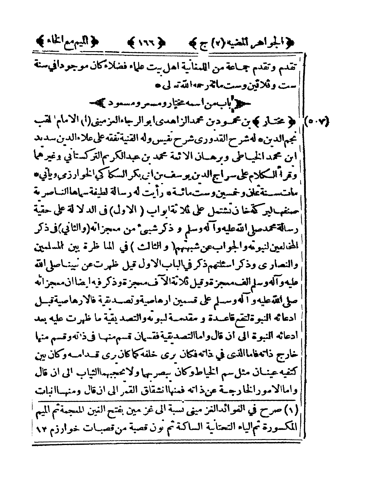 507 - مُخْتَار بن مَحْمُود بن مُحَمَّد الزَّاهدِيّ أَبُو الرَّجَاء العزميني الإِمَام الملقب نجم الدّين لَهُ شرح الْقَدُورِيّ شرح نَفِيس وَله الْقنية تفقه على عَلَاء الدّين بن سديد ابْن مُحَمَّد الخياطي وبرهان الْأَئِمَّة مُحَمَّد بن عبد الْكَرِيم التكستاني وَغَيرهمَا وَقَرَأَ الْكَلَام على سراج الدّين يُوسُف بن أبي بكر السكاكي الْخَوَارِزْمِيّ وَيَأْتِي مَاتَ سنة ثَمَان وَخمسين وست مائَة رَأَيْت لَهُ رِسَالَة لَطِيفَة سَمَّاهَا الناصرية صنفها لبركة خَان تشْتَمل على ثَلَاثَة أَبْوَاب الأول فى الدّلَالَة على حقية رِسَالَة مُحَمَّد صلى الله عَلَيْهِ وَسلم وَذكر شَيْء من معجزاته وَالثَّانِي فى ذكر الْمُخَالفين لنبوته وَالْجَوَاب عَن شبهتهم وَالثَّالِث فى المناظرة بَين الْمُسلمين والنصاري وَذكر أسئلتهم ذكر فى الْبَاب الأول قيل ظَهرت عَن نَبينَا صلى الله عَلَيْهِ وَسلم الف معْجزَة وَقيل ثَلَاثَة الآف معْجزَة وَذكر فِيهِ أَيْضا ان معجزاته صلى الله عَلَيْهِ وَسلم على قسمَيْنِ أرهاصية وتصديقية فالأرهاصية قبل ادعائه النُّبُوَّة لتقع قَاعِدَة ومقدمة لنبوته والتصديقية مَا ظَهرت عَلَيْهِ بعد ادعائه النُّبُوَّة إِلَى أَن قَالَ وَأما التصديقية فقسمان قسم مِنْهَا فى ذَاته وَقسم مِنْهَا خَارج ذَاته فَأَما الَّذِي فى ذَاته فَكَانَ يرى خَلفه كَمَا كَانَ يرى قدامه وَكَانَ بَين كَتفيهِ عينان مثل سم الْخياط وَكَانَ يبصر بهما وَلَا يحجبهما الثِّيَاب إِلَى أَن قَالَ وَأما الْأُمُور الْخَارِجَة عَن ذَاته فَمِنْهَا انْشِقَاق الْقَمَر إِلَى أَن قَالَ وَمِنْهَا انبات