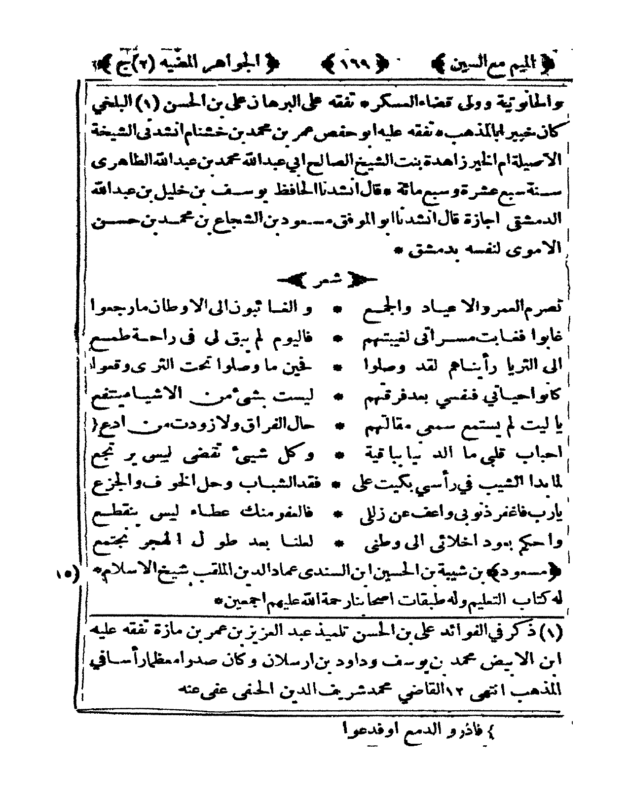 والحانوتية وَولى قَضَاء الْعَسْكَر تفقه على الْبُرْهَان عَليّ بن الْحسن الْبَلْخِي كَانَ خَبِيرا بِالْمذهبِ تفقه عَلَيْهِ أَبُو حَفْص عمر بن مُحَمَّد بن خشنام أَنْشدني الشيخة الأصيلة أم الْخَيْر زاهدة بنت الشَّيْخ الصَّالح أبي عبد الله مُحَمَّد بن عبد الله الطاهري سنة سبع عشرَة وَسبع مائَة قَالَ أنشدنا الْحَافِظ يُوسُف بن خَلِيل بن عبد الله الدِّمَشْقِي إجَازَة قَالَ أنشدنا أَبُو الْمُوفق مَسْعُود بن الشجاع بن مُحَمَّد بن حسن الْأمَوِي لنَفسِهِ بِدِمَشْق شعر ... تصرم الْعُمر والأعياد وَالْجمع ... والغائبون إِلَى الأوطان مَا رجعُوا