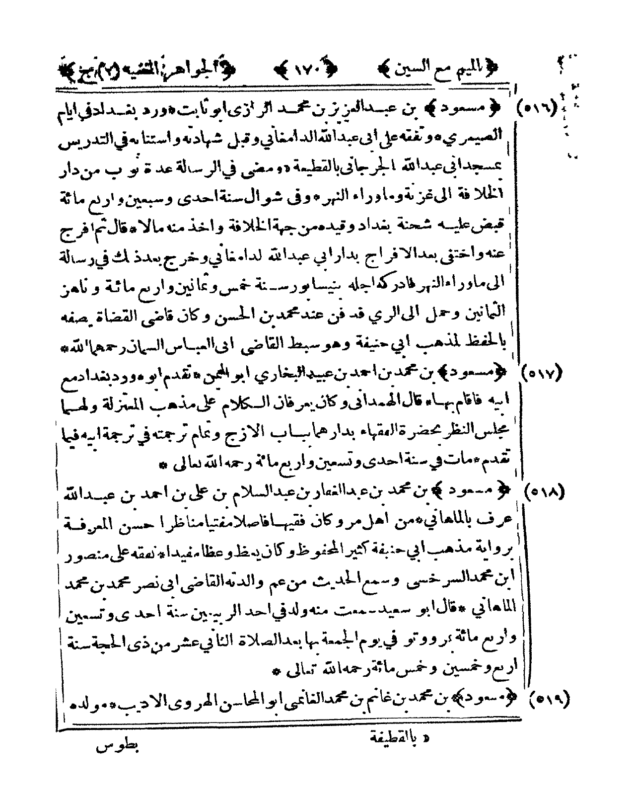 516 - مَسْعُود بن عبد الْعَزِيز بن مُحَمَّد الرَّازِيّ أَبُو ثَابت ورد بَغْدَاد فى أَيَّام الصَّيْمَرِيّ وتفقه على أبي عبد الله الدَّامغَانِي وَقبل شَهَادَته واستنابه فى التدريس بِمَسْجِد أبي عبد الله الْجِرْجَانِيّ بالقطيعة وَمضى فى الرسَالَة عدَّة نوب من دَار الْخلَافَة إِلَى غزنة وَمَا وَرَاء النَّهر وفى شَوَّال سنة إِحْدَى وَسبعين وَأَرْبع مائَة قبض عَلَيْهِ شحنة بَغْدَاد وَقَيده من جِهَة الْخلَافَة وَأخذ مِنْهُ مَالا قَالَ ثمَّ أفرج عَنهُ واختفى بعد الإفراج بدار أبي عبد الله الدَّامغَانِي وَخرج بعد ذَلِك فى رِسَالَة إِلَى مَا وَرَاء النَّهر فأدركه أَجله بنيسابور سنة خمس وَثَمَانِينَ وَأَرْبع مائَة وناهز الثَّمَانِينَ وَحمل إِلَى الرّيّ فَدفن عِنْد مُحَمَّد بن الْحسن وَكَانَ قَاضِي الْقُضَاة يصفه بِالْحِفْظِ لمَذْهَب أبي حنيفَة وَهُوَ سبط القَاضِي أبي الْعَبَّاس السمان رحمهمَا الله
