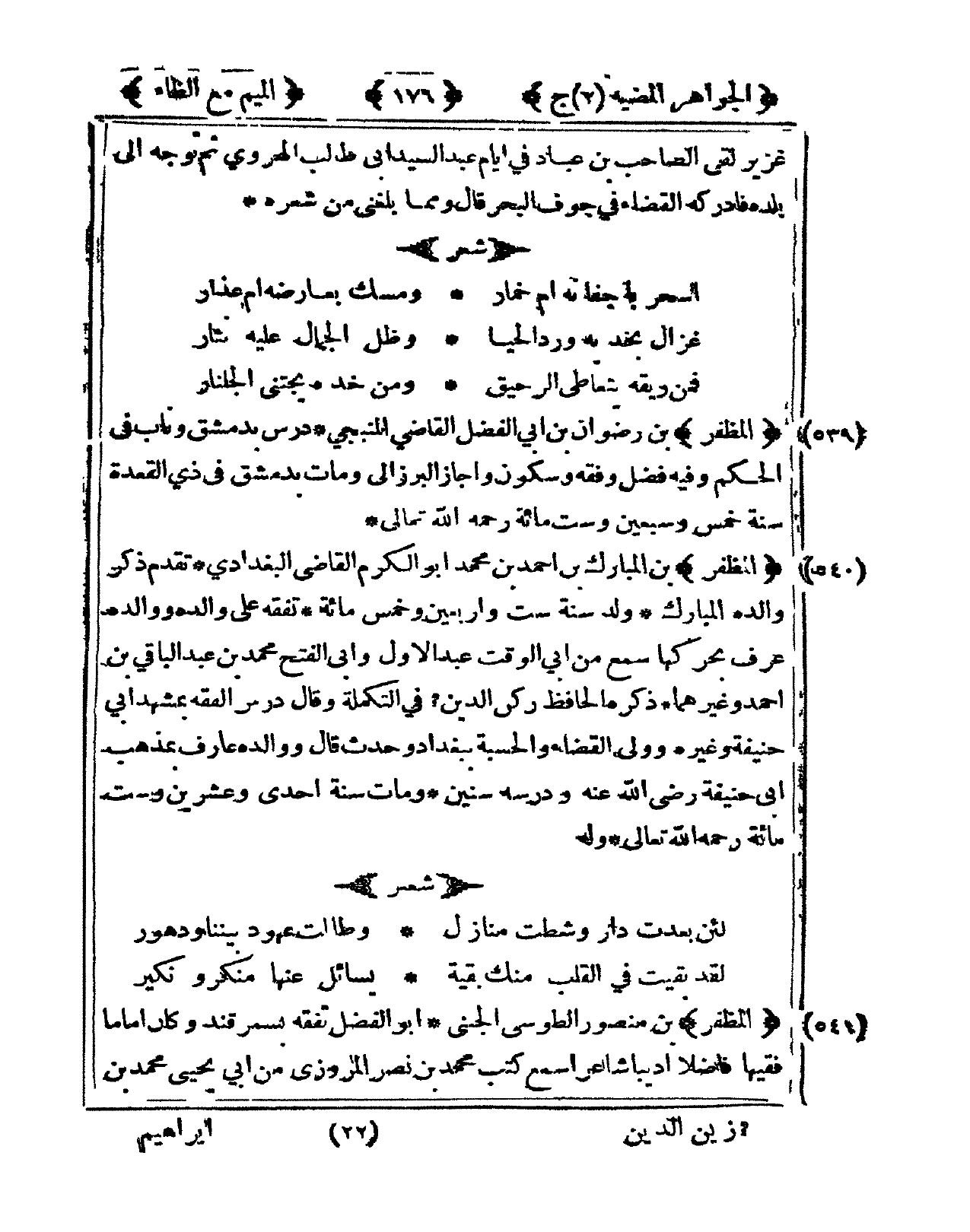 540 - المظفر بن الْمُبَارك بن أَحْمد بن مُحَمَّد أَبُو الْكَرم القَاضِي الْبَغْدَادِيّ تقدم ذكره وَالِده الْمُبَارك ولد سنة سِتّ وَأَرْبَعين وَخمْس مائَة تفقه على وَالِده ووالده عرف بحركها سمع من أبي الْوَقْت عبد الأول وَأبي الْفَتْح مُحَمَّد بن عبد الْبَاقِي بن أَحْمد وَغَيرهمَا ذكره الْحَافِظ ركن الدّين فِي التكملة وَقَالَ درس الْفِقْه بمشهد أبي حنيفَة وَغَيره وَولى الْقَضَاء والحسبة بِبَغْدَاد وَحدث قَالَ ووالده عَارِف بِمذهب أبي حنيفَة رَضِي الله عَنهُ ودرسه سِنِين وَمَات سنة إِحْدَى وَعشْرين وست مائَة رَحمَه الله تَعَالَى وَله شعر ... لَئِن بَعدت دَار وشطت منَازِل ... وطالت عهود بَيْننَا ودهور