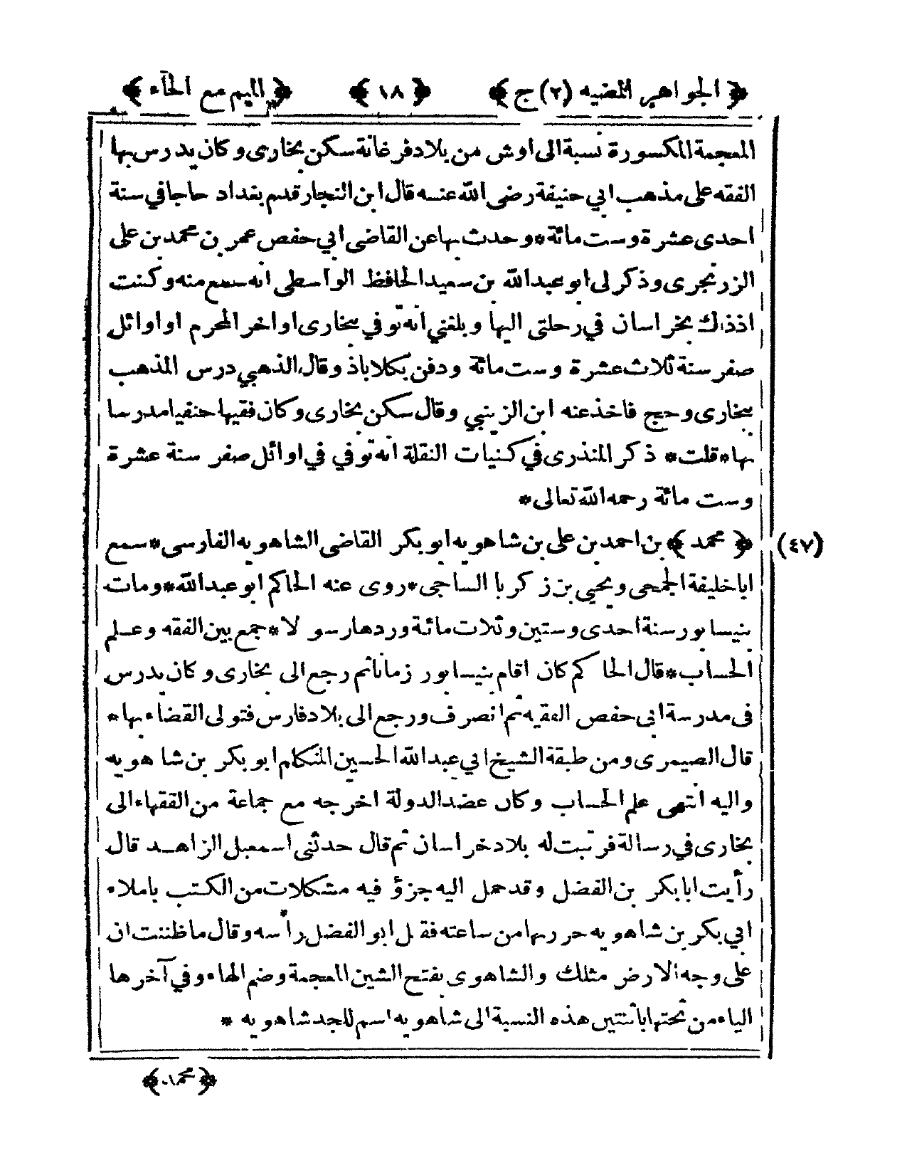 47 - مُحَمَّد بن أَحْمد بن عَليّ بن شاهويه أَبُو بكر القَاضِي الشاهويه الْفَارِسِي سمع أَبَا خَليفَة الجُمَحِي وَيحيى بن زَكَرِيَّا السَّاجِي روى عَنهُ الْحَاكِم أبوعبد الله وَمَات بنيسابور سنة إِحْدَى وَسِتِّينَ وَثَلَاث مائَة وردهَا رَسُولا جمع بَين الْفِقْه وَعلم الْحساب قَالَ الْحَاكِم كَانَ أَقَامَ بنيسابور زَمَانا ثمَّ رَجَعَ إِلَى بُخَارى وَكَانَ يدرس فى مدرسة أبي حَفْص الْفَقِيه ثمَّ انْصَرف وَرجع إِلَى بِلَاد فَارس فَتَوَلّى الْقَضَاء بهَا قَالَ الصَّيْمَرِيّ وَمن طبقَة الشَّيْخ أبي عبد الله الْحُسَيْن الْمُتَكَلّم أَبُو بكر بن شاهويه وَإِلَيْهِ انْتهى علم الْحساب وَكَانَ عضد الدولة أخرجه مَعَ جمَاعَة من الْفُقَهَاء إِلَى بُخَارى فى رِسَالَة فرتبت لَهُ بِلَاد خُرَاسَان ثمَّ قَالَ حَدثنِي إِسْمَعِيل الزَّاهِد قَالَ رَأَيْت أَبَا بكر بن الْفضل وَقد حمل إِلَيْهِ جزؤ فِيهِ مشكلات من الْكتب بإملاء أبي بكر بن شاهويه حرر بهَا من سَاعَته فَقبل أَبُو الْفضل رَأسه وَقَالَ مَا ظَنَنْت أَن على وَجه الأَرْض مثلك والشاهوي بِفَتْح الشين الْمُعْجَمَة وَضم الْهَاء وفى آخرهَا الْيَاء من تحتهَا بإثنتين هَذِه النِّسْبَة إِلَى شاهويه اسْم للْجدّ شاهويه