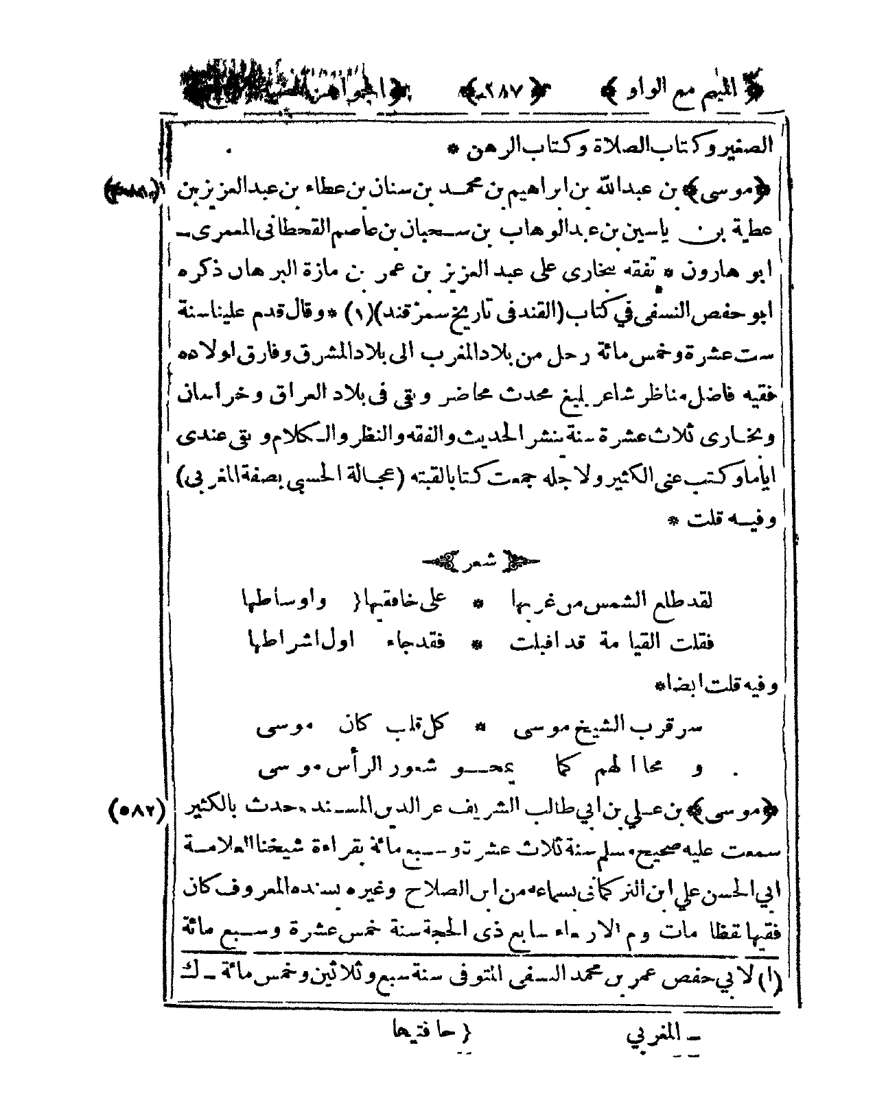581 - مُوسَى بن عبد الله بن إِبْرَاهِيم بن مُحَمَّد بن سِنَان بن عَطاء بن عبد الْعَزِيز بن عَطِيَّة بن ياسين بن عبد الْوَهَّاب بن سحبان بن عَاصِم القحطاني المعمري أَبُو هَارُون تفقه ببخارى على عبد الْعَزِيز بن عمر بن مازة الْبُرْهَان ذكره أَبُو حَفْص النَّسَفِيّ فى كتاب القند فى تَارِيخ سَمَرْقَنْد وَقَالَ قدم علينا سنة سِتّ عشرَة وَخمْس مائَة رَحل من بِلَاد الْمغرب إِلَى بِلَاد الْمشرق وَفَارق أَوْلَاده فَقِيه فَاضل مناظر شَاعِر بليغ مُحدث محَاضِر وَبَقِي فى بِلَاد الْعرَاق وخراسان وبخارى ثَلَاث عشرَة سنة ينشر الحَدِيث وَالْفِقْه وَالنَّظَر وَالْكَلَام وَبَقِي عِنْدِي أَيَّامًا وَكتب عني الْكثير ولأجله جمعت كتابا لقبته عجالة الحسبي بِصفة المغربي وَفِيه قلت شعر ... لقد طلع الشَّمْس من غربها ... على خافقيها وأوساطها