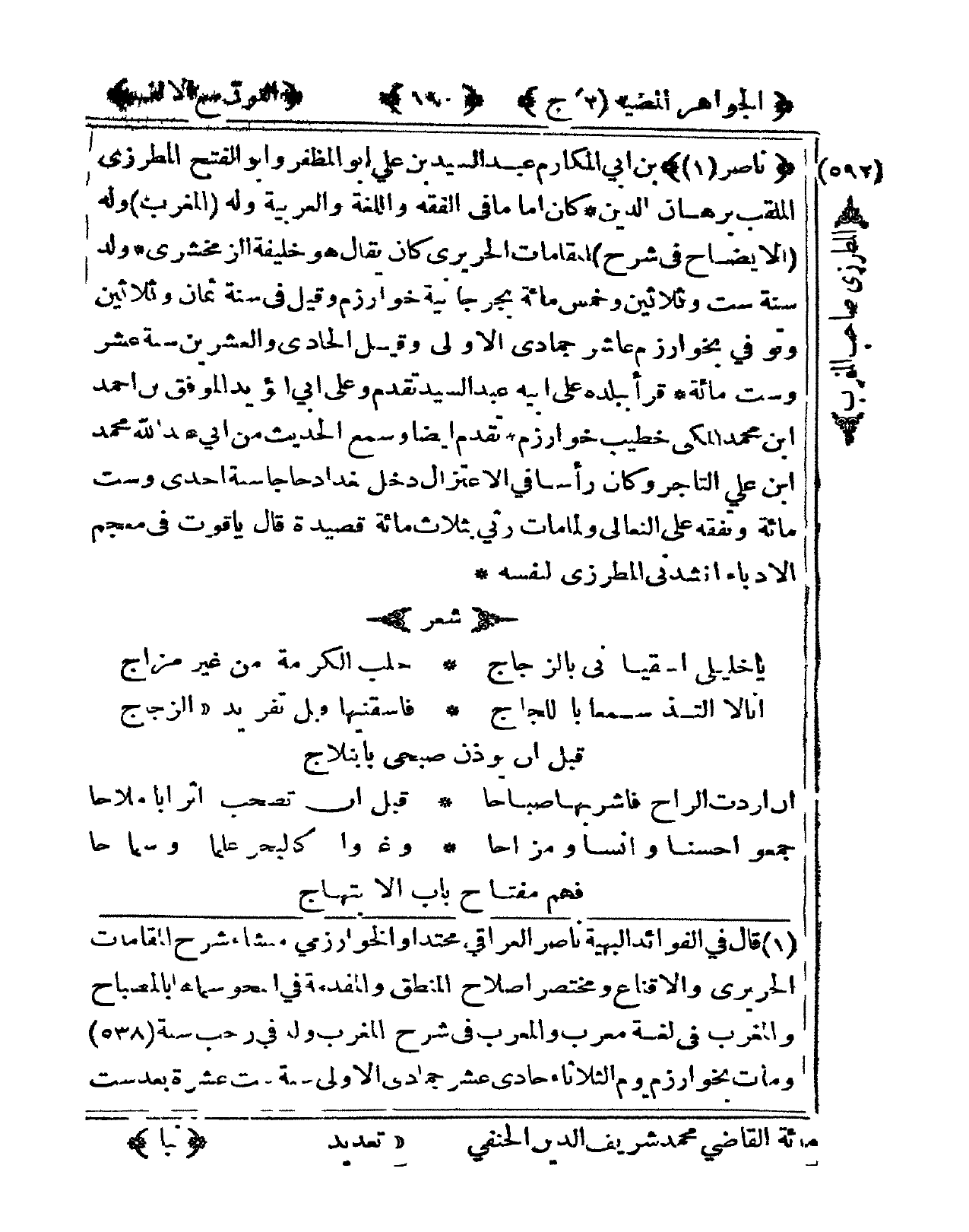 592 - نَاصِر بن أبي المكارم عبد السَّيِّد بن عَليّ أَبُو المظفر وَأَبُو الْفَتْح المطرزي المقلب برهَان الدّين كَانَ إِمَام فى الْفِقْه واللغة والعربية وَله الْمغرب وَله الْإِيضَاح فى شرح المقامات الحريري كَانَ يُقَال هُوَ خَليفَة الزَّمَخْشَرِيّ ولد سنة سِتّ وَثَلَاثِينَ وَخمْس مائَة بجرجانية خوارزم وَقيل فى سنة ثَمَان وَثَلَاثِينَ وَتُوفِّي بخوارزم عَاشر جمادي الأولى وَقيل الْحَادِي وَالْعِشْرين سنة عشر وست مائَة قَرَأَ بِبَلَدِهِ على أَبِيه عبد السَّيِّد تقدم وعَلى أبي الْمُؤَيد الْمُوفق بن أَحْمد ابْن مُحَمَّد الْمَكِّيّ خطيب خوارزم تقدم أَيْضا وَسمع الحَدِيث من أبي عبد الله مُحَمَّد ابْن عَليّ التَّاجِر وَكَانَ رَأْسا فى الإعتزال دخل بَغْدَاد حَاجا سنة إِحْدَى وست مائَة وتفقه على النعالي وَلما مَاتَ رثي بِثَلَاث مائَة قصيدة قَالَ ياقوت فى مُعْجم الأدباء أَنْشدني المطرزي لنَفسِهِ شعر ... يَا خليلي أسقياني بالزجاج ... حلب الكرمة من غير مزاج
