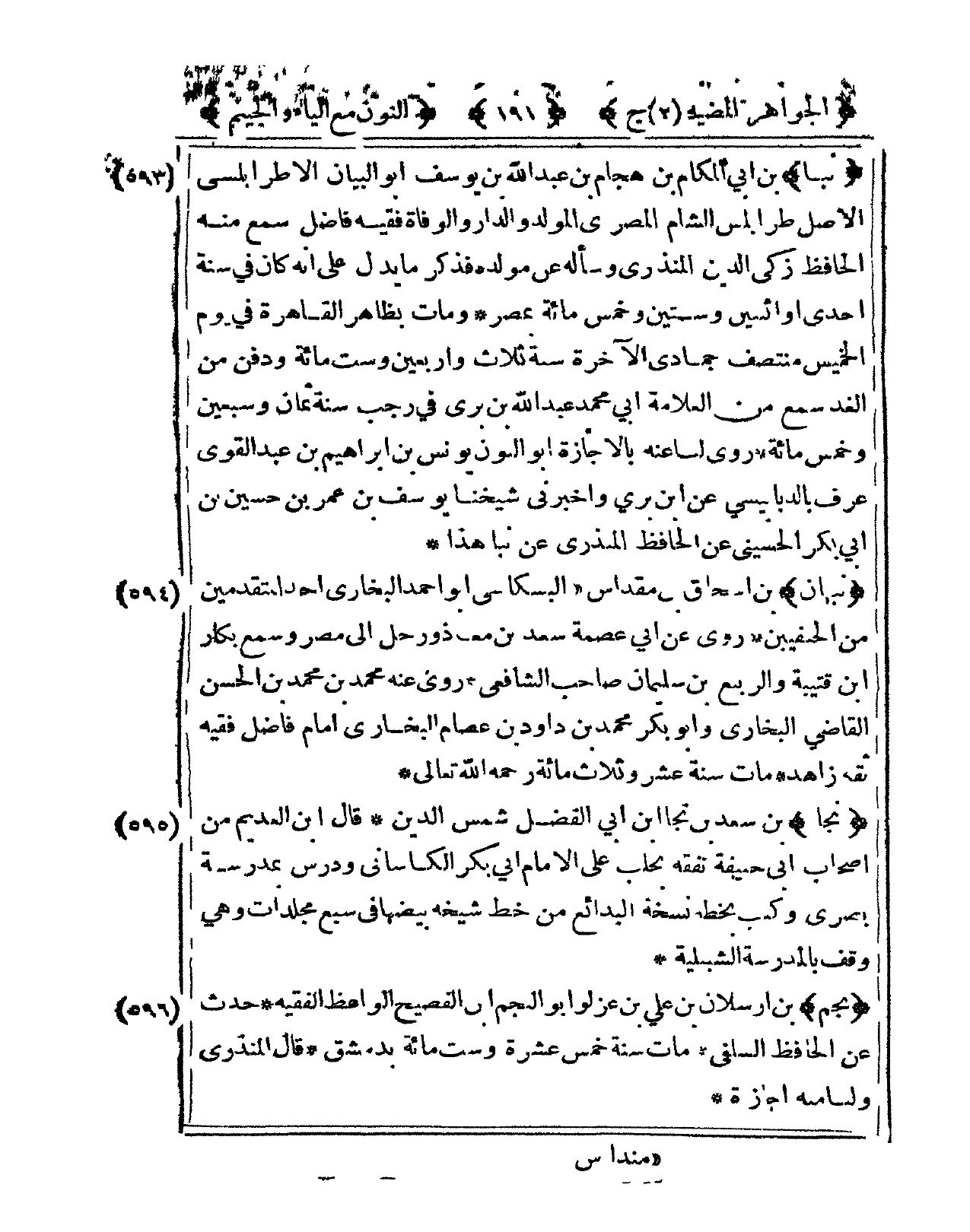 595 - نجا بن سعد بن نجا ابْن أبي الْفضل شمس الدّين قَالَ ابْن العديم من أَصْحَاب أبي حنيفَة تفقه بحلب على الإِمَام أبي بكر الكاساني ودرس بمدرسة بصرى وَكتب بِخَطِّهِ نُسْخَة الْبَدَائِع من خطّ شَيْخه بيضها فى سبع مجلدات وهى وقف بِالْمَدْرَسَةِ الشبيلية