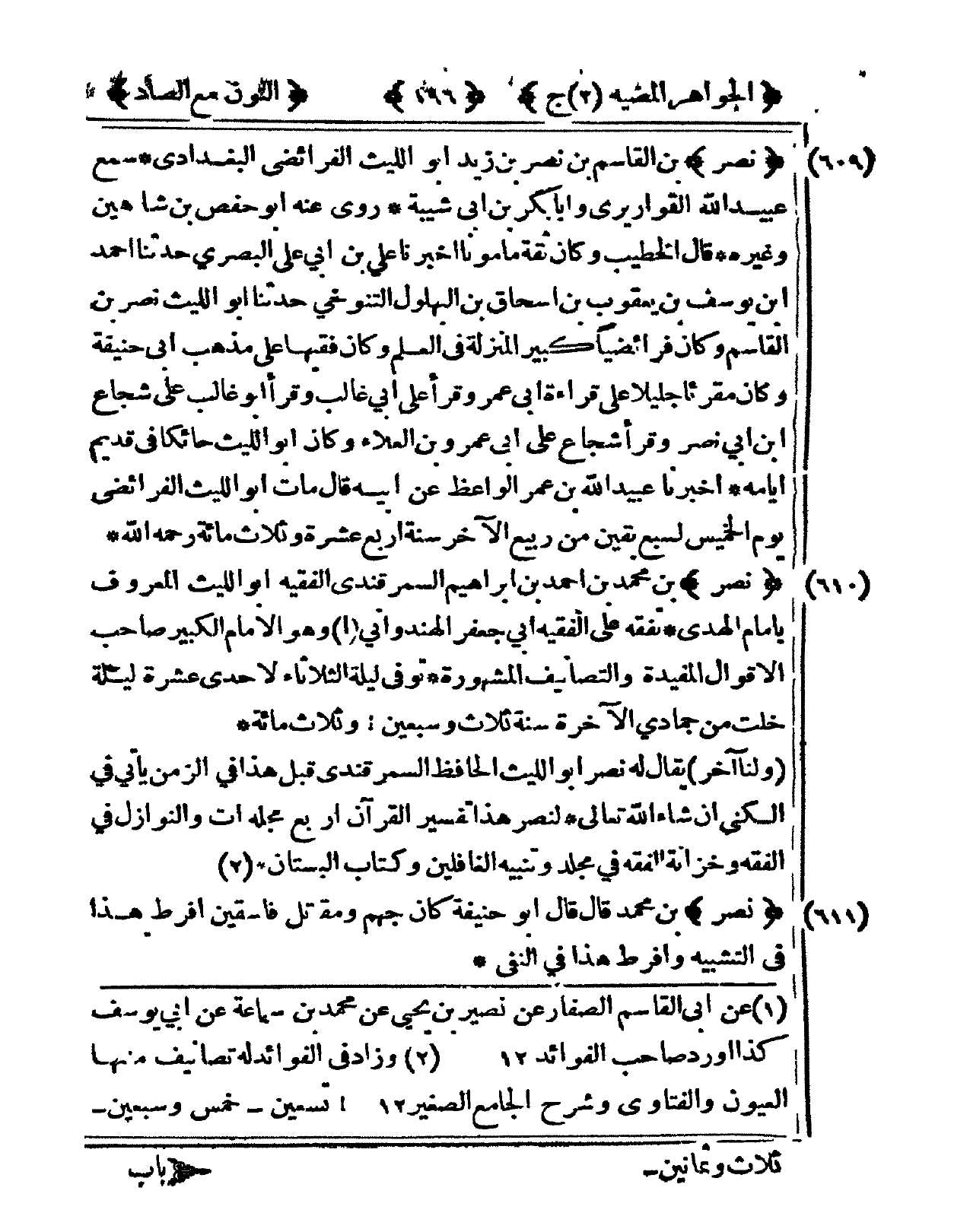 610 - نصر بن مُحَمَّد بن أَحْمد بن إِبْرَاهِيم السَّمرقَنْدِي الْفَقِيه أَبُو اللَّيْث الْمَعْرُوف بِإِمَام الْهدى تفقه على الْفَقِيه أَبُو جَعْفَر الهندواني وَهُوَ الإِمَام الْكَبِير صَاحب الْأَقْوَال المفيدة والتصانيف الْمَشْهُورَة توفّي لَيْلَة الثُّلَاثَاء لإحدى عشرَة لَيْلَة خلت من جمادي الْآخِرَة سنة ثَلَاث وَسبعين وَثَلَاث مائَة
