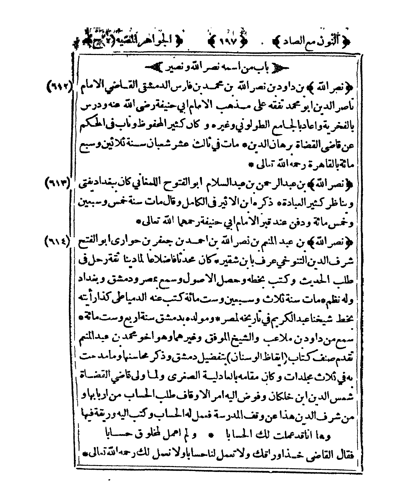 612 - نصر الله بن دَاوُد بن نصر الله بن مُحَمَّد بن فَارس الدِّمَشْقِي القَاضِي الإِمَام نَاصِر الدّين أَبُو مُحَمَّد تفقه على مَذْهَب الإِمَام أبي حنيفَة رَضِي الله عَنهُ ودرس بالفخرية وَأعَاد بالجامع الطولوني وَغَيره وَكَانَ كثير الْمَحْفُوظ وناب فى الحكم على قَاضِي الْقُضَاة برهَان الدّين مَاتَ فى ثَالِث عشر شعْبَان سنة ثَلَاثِينَ وَسبع مائَة بِالْقَاهِرَةِ رَحمَه الله تَعَالَى