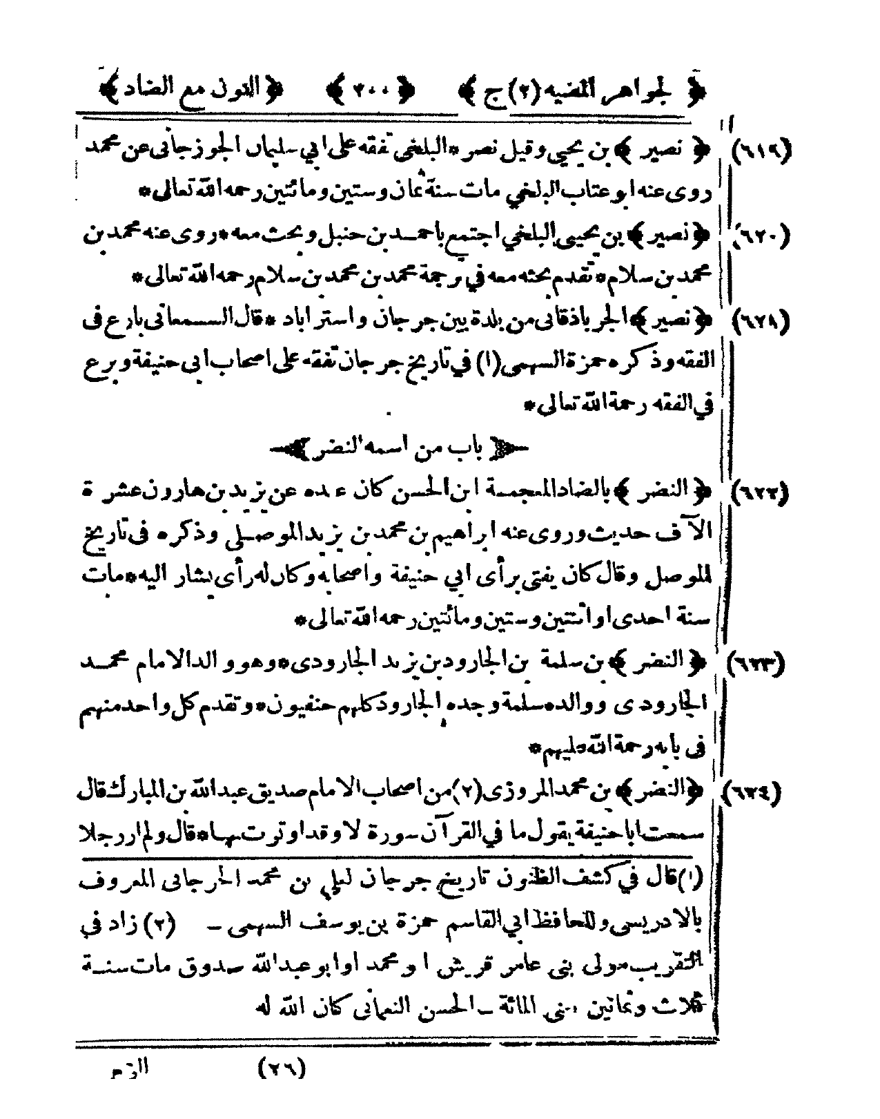619 - نصير بن يحيى وَقيل نصر الْبَلْخِي تفقه على أبي سُلَيْمَان الْجوزجَاني عَن مُحَمَّد روى عَنهُ أَبُو عتاب الْبَلْخِي مَاتَ سنة ثَمَان وَسِتِّينَ وَمِائَتَيْنِ رَحمَه الله تَعَالَى