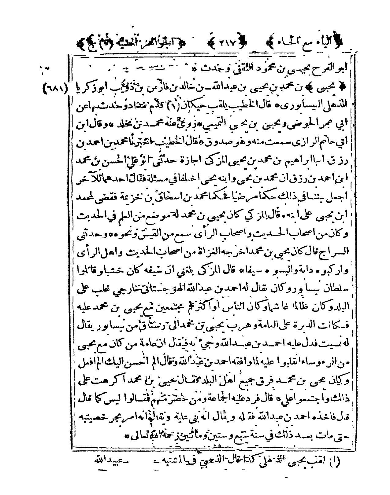 681 - يحيى بن مُحَمَّد بن يحيى بن عبد الله بن خَالِد بن فَارس بن ذويب أَبُو زَكَرِيَّا الذهلي النَّيْسَابُورِي قَالَ الْخَطِيب يلقب حبكان قدم بَغْدَاد وَحدث بهَا عَن أبي عمر الحوضي وَيحيى بن يحيى التَّمِيمِي روى عَنهُ مُحَمَّد بن مخلد وَقَالَ ابْن أبي حَاتِم الرَّازِيّ سَمِعت مِنْهُ وَهُوَ صَدُوق قَالَ الْخَطِيب أخبرنَا مُحَمَّد بن أَحْمد بن رزق إبنا إِبْرَاهِيم بن مُحَمَّد بن يحيى الْمُزَكي إجَازَة حَدثنِي أَبُو عَليّ الْحسن بن مُحَمَّد ابْن أَحْمد بن رزق أَن مُحَمَّد بن يحيى وَابْنه يحيى اخْتلفَا فى مسئلة فَقَالَ آحدهما للْآخر اجْعَل بَيْننَا فى ذَلِك حكما مرضيا فحكما مُحَمَّد بن اسحاق بن خُزَيْمَة فَقضى لمُحَمد ابْن يحيى على ابْنه قَالَ الْمُزَكي كَانَ يحيى بن مُحَمَّد لَهُ مَوضِع من الْعلم فى الحَدِيث وَكَانَ من أَصْحَاب الحَدِيث وَأَصْحَاب الرَّأْي سمع من الْقَيْس وَنَحْوه وحَدثني السراج قَالَ كَانَ يحيى بن مُحَمَّد أخرجه الْغُزَاة من أَصْحَاب الحَدِيث وَأهل الرَّأْي وأركبوه دَابَّة وألبسوه سَيْفا قَالَ المزكى بَلغنِي أَن سَيْفه كَانَ خشبا وقاتلوا سُلْطَان نيسابور وَكَانَ يُقَال لَهُ أَحْمد بن عبد الله الهوجستانى خارجي غلب على الْبَلَد وَكَانَ ظَالِما غاشما وَكَانَ النَّاس أَو أَكْثَرهم مُجْتَمعين مَعَ يحيى بن مُحَمَّد عَلَيْهِ فَكَانَت الدبرة على الْعَامَّة وهرب يحيى بن مُحَمَّد الى رستاق من نيسابور يُقَال لَهُ نسيت فَدلَّ عَلَيْهِ أَحْمد بن عبد الله وجيئ بِهِ فَيُقَال أَن عَامَّة من كَانَ مَعَ يحيى من الرؤساء انقلبوا عَلَيْهِ لما وَافقه أَحْمد بن عبد الله وَقَالَ ألم أحسن إِلَيْك ألم أفعل وَكَانَ يحيى بن مُحَمَّد فرق جَمِيع أهل الْبَلَد فَقَالَ يحيى بن مُحَمَّد أكرهت عَليّ ذَلِك واجتمعوا عَليّ قَالَ فَرد عَلَيْهِ الْجَمَاعَة وَمن حضر مِنْهُم فَقَالُوا لَيْسَ كَمَا قَالَ قَالَ فَأَخذه أَحْمد بن عبد الله فَقتله وَيُقَال أَنه بنى عَلَيْهِ وَيُقَال أَنه أَمر بجر خصيتيه حَتَّى مَاتَ بعد ذَلِك فى سنة سبع وَسِتِّينَ وَمِائَتَيْنِ رَحمَه الله تَعَالَى