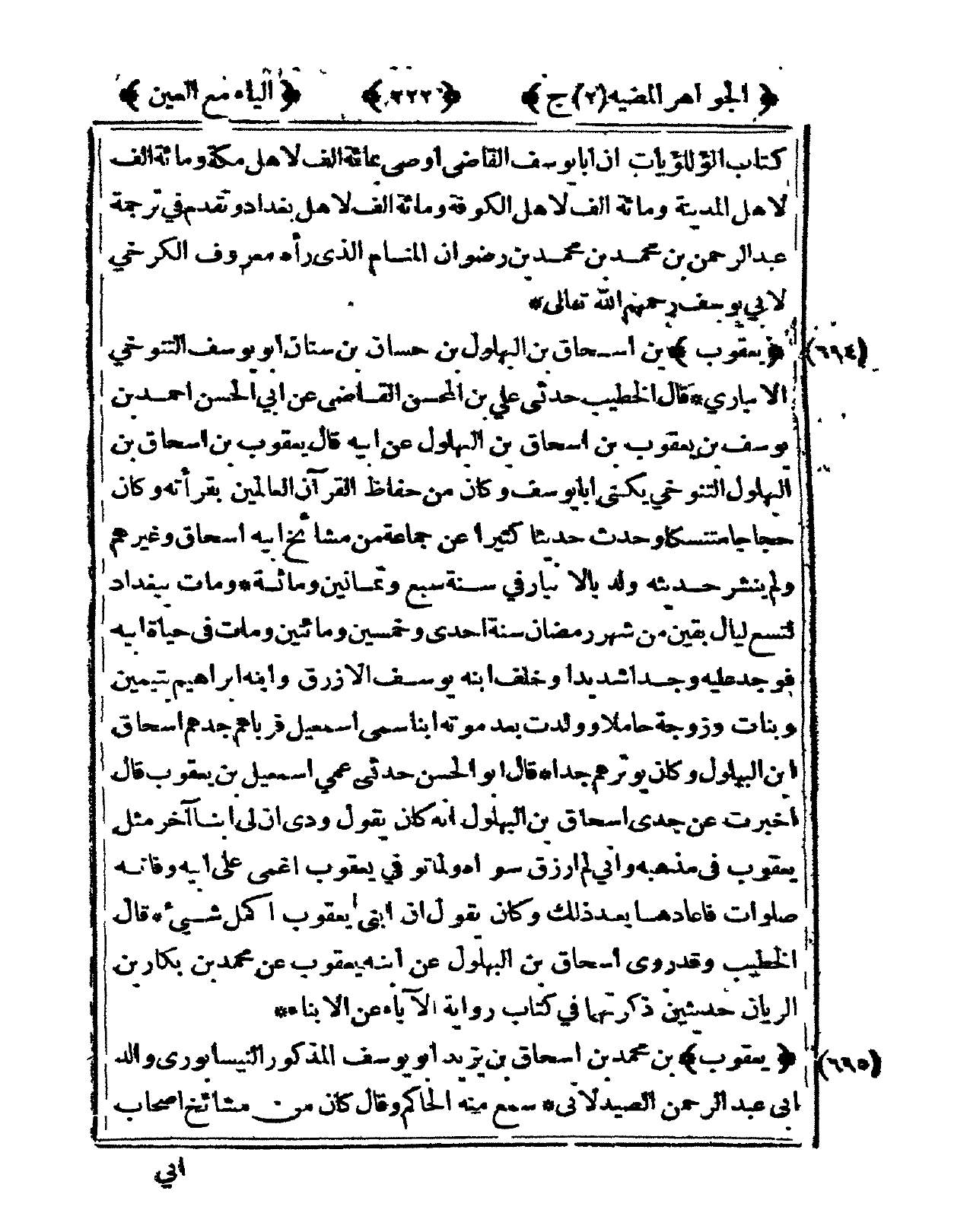694 - يَعْقُوب بن إِسْحَاق بن البهلول بن حسان بن سِنَان أَبُو يُوسُف التنوخي الْأَنْبَارِي قَالَ الْخَطِيب حَدثنِي عَليّ بن المحسن القَاضِي عَن أبي الْحسن أَحْمد بن يُوسُف بن يَعْقُوب بن إِسْحَاق بن البهلول عَن أَبِيه قَالَ يَعْقُوب بن إِسْحَاق بن البهلول التنوخي يكنى أَبَا يُوسُف وَكَانَ من حفاظ الْقُرْآن الْعَالمين بقرأته وَكَانَ حجاجا متنسكا وَحدث حَدِيثا كثيرا عَن جمَاعَة من مشائخ أَبِيه إِسْحَاق وَغَيرهم وَلم ينشر حَدِيثه ولد بالأنبار فى سنة سبع وَثَمَانِينَ وَمِائَة وَمَات بِبَغْدَاد لتسْع لَيَال بَقينَ من شهر رَمَضَان سنة إِحْدَى وَخمسين وَمِائَتَيْنِ وَمَات فى حَيَاة أَبِيه فَوجدَ عَلَيْهِ وجدا شَدِيدا وَخلف ابْنه يُوسُف الْأَزْرَق وَابْنه إِبْرَاهِيم يتيمين وَبَنَات وَزَوْجَة حَامِلا وَولدت بعد مَوته ابْنا سمي إِسْمَعِيل فرباهم جدهم إِسْحَاق ابْن البهلول وَكَانَ يوثرهم جدا قَالَ أَبُو الْحسن حَدثنِي عمي إِسْمَعِيل بن يَعْقُوب قَالَ أخْبرت عَن جدى إِسْحَاق بن البهلول أَنه كَانَ يَقُول ودي أَن لى ابْنا آخر مثل يَعْقُوب فى مذْهبه وَأَنِّي لم أرزق سواهُ وَلما توفّي يَعْقُوب أُغمي على أَبِيه وَفَاته صلوَات فَأَعَادَهَا بعد ذَلِك وَكَانَ يَقُول أَن ابنى يَعْقُوب أكمل شيئ قَالَ الْخَطِيب وَقد روى إِسْحَاق بن البهلول عَن ابْنه يَعْقُوب عَن مُحَمَّد بن بكار بن الريان حديثين ذكرتهما فى كتاب رِوَايَة الْآبَاء عَن الْأَبْنَاء