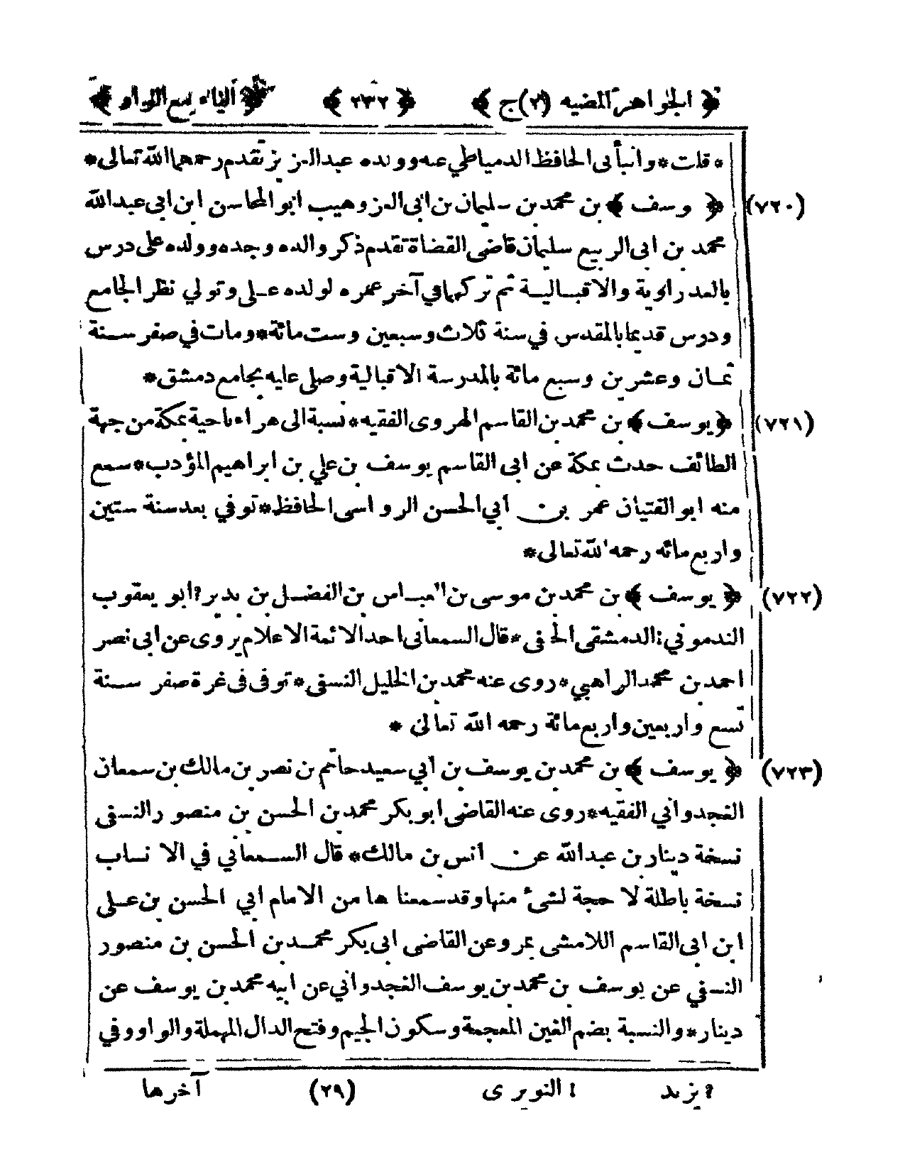 722 - يُوسُف بن مُحَمَّد بن مُوسَى بن الْعَبَّاس بن الْفضل بن بديري أَبُو يَعْقُوب الندموني الدِّمَشْقِي الْحَنَفِيّ قَالَ السَّمْعَانِيّ أحد الْأَئِمَّة الْأَعْلَام يرْوى عَن أبي نصر أَحْمد بن مُحَمَّد الراهبي روى عَنهُ مُحَمَّد بن الْخَلِيل النَّسَفِيّ توفّي فى غرَّة صفر سنة تسع وَأَرْبَعين وَأَرْبع مائَة رَحمَه الله تَعَالَى