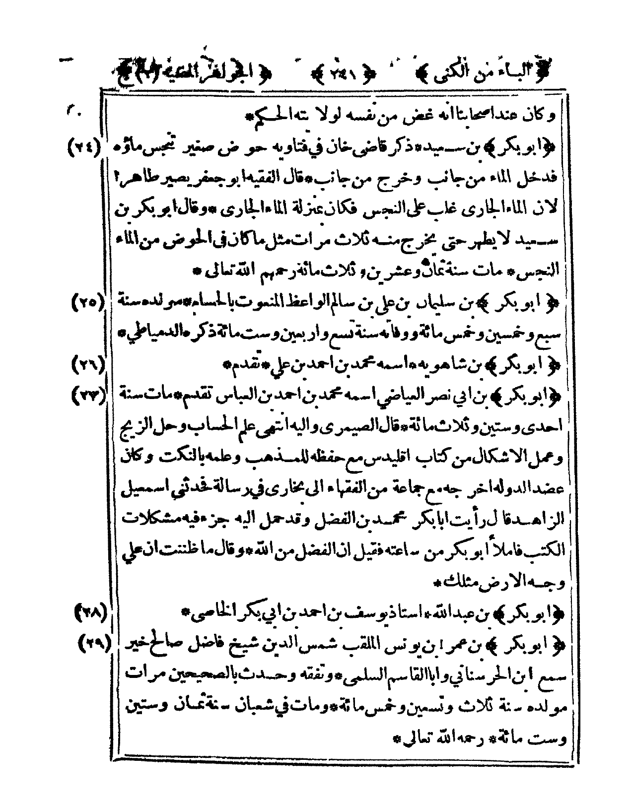 24 - أَبُو بكر بن سعيد ذكر قَاضِي خَان فى فَتَاوِيهِ حَوْض صَغِير تنجس مَاؤُهُ فَدخل المَاء من جَانب وَخرج من جَانب قَالَ الْفَقِيه أَبُو جَعْفَر يصير طَاهِرا لِأَن المَاء الْجَارِي غلب على النَّجس فَكَانَ بِمَنْزِلَة المَاء الْجَارِي وَقَالَ أَبُو بكر بن سعيد لَا يطهر حَتَّى يخرج مِنْهُ ثَلَاث مَرَّات مثل مَا كَانَ فى الْحَوْض من المَاء النَّجس مَاتَ سنة ثَمَان وَعشْرين وَثَلَاث مائَة رَحِمهم الله تَعَالَى