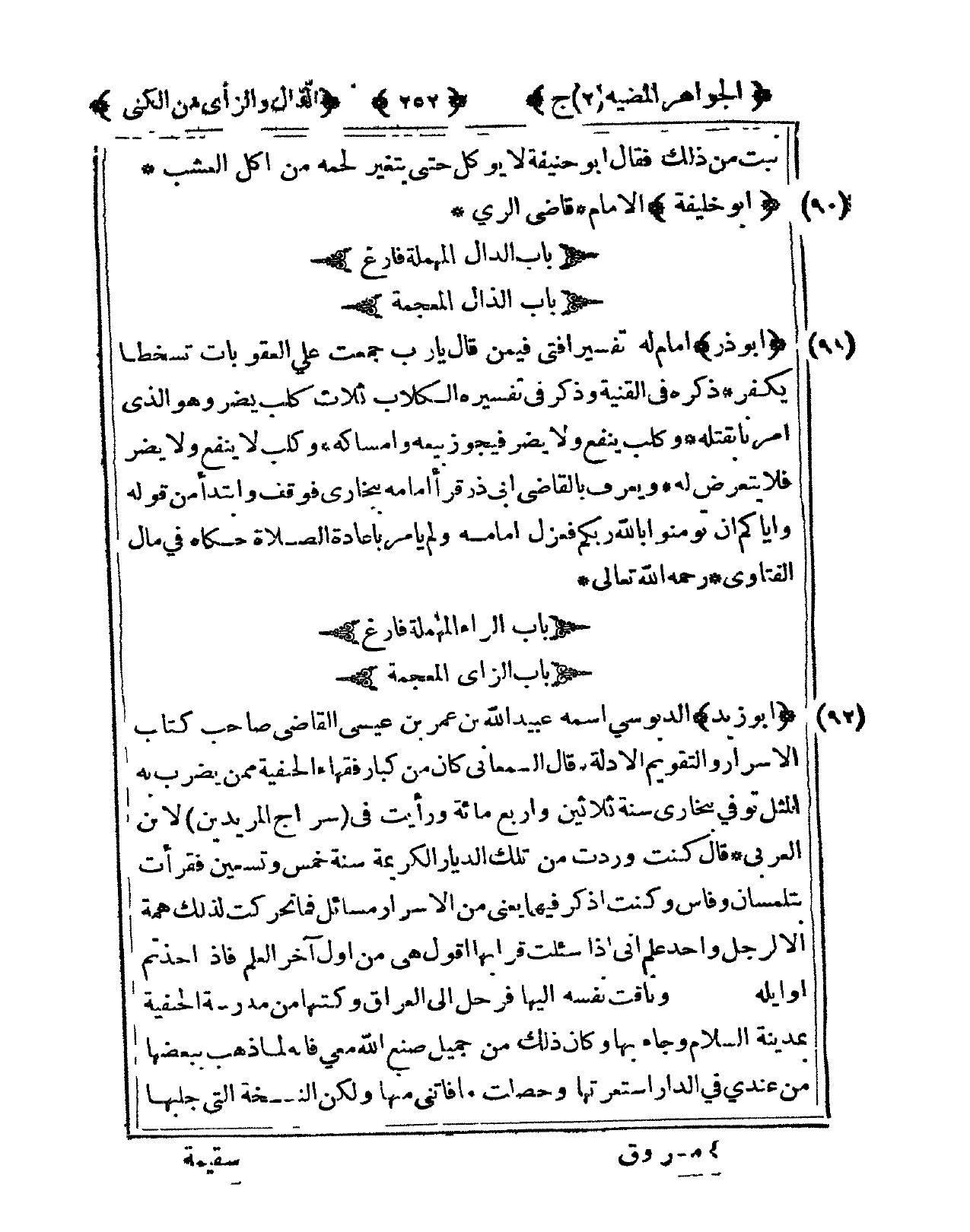 92 - أَبُو زيد الدبوسي اسْمه عبيد الله بن عمر بن عِيسَى القَاضِي صَاحب كتاب الْأَسْرَار والتقويم الْأَدِلَّة قَالَ السَّمْعَانِيّ كَانَ من كبار فُقَهَاء الْحَنَفِيَّة مِمَّن يضْرب بِهِ الْمثل توفّي ببخارى سنة ثَلَاثِينَ وَأَرْبع مائَة وَرَأَيْت فى سراج المريدين لإبن الْعَرَبِيّ قَالَ كنت وَردت من تِلْكَ الديار الْكَرِيمَة سنة خمس وَتِسْعين فَقَرَأت بتلمسان وفاس وَكنت أذكر فيهمَا يَعْنِي من الْأَسْرَار مسَائِل فَمَا تحركت لذَلِك همة إِلَّا لرجل وَاحِد علم أَنِّي إِذا سُئِلت قرابها أَقُول هى من أول آخر الْعلم فَإِذا أَخَذْتُم أوايله وتاقت نَفسه إِلَيْهَا فَرَحل إِلَى الْعرَاق وكتبها من مدرسة الْحَنَفِيَّة بِمَدِينَة السَّلَام وَجَاء بهَا وَكَانَ ذَلِك من جميل صنع الله معي فَإِنَّهُ لما ذهب بَعْضهَا من عِنْدِي فى الدَّار استعرتها وحصلت مَا فَاتَنِي مِنْهَا وَلَكِن النُّسْخَة الَّتِى جلبها
