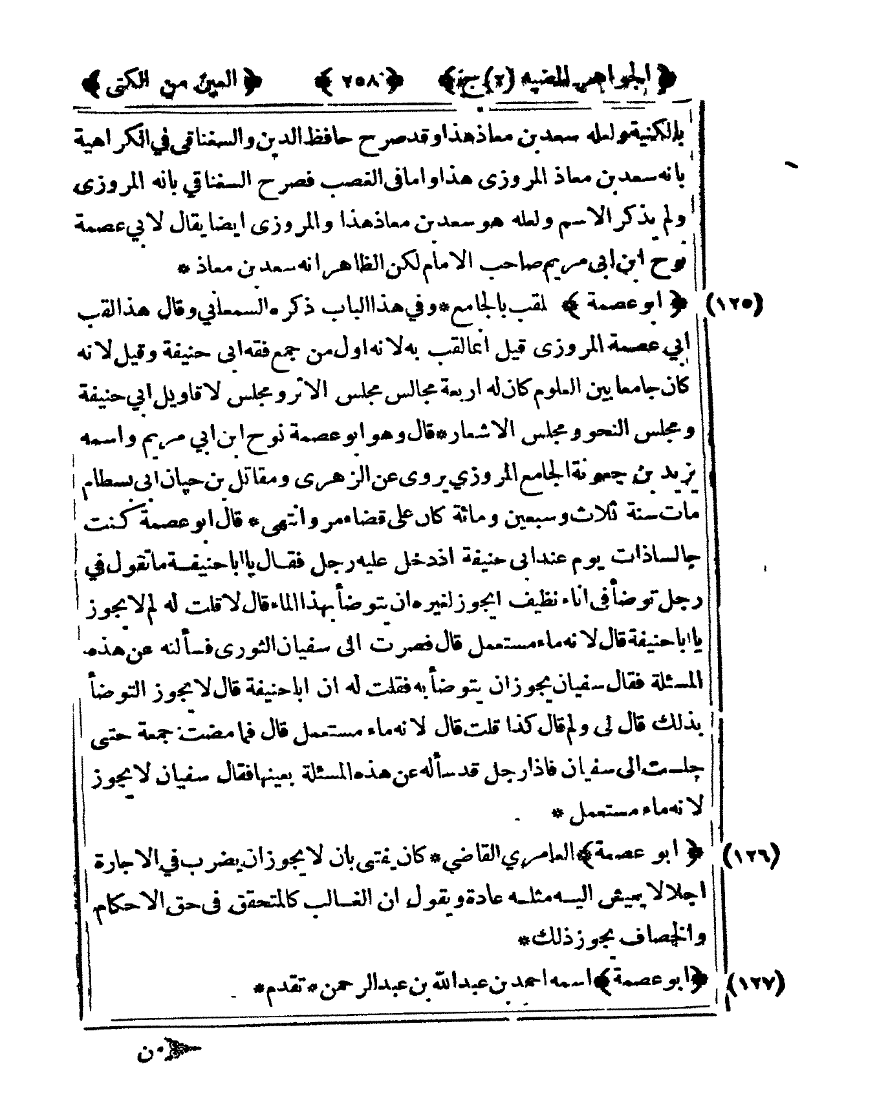 125 - أَبُو عصمَة الملقب بالجامع وفى هَذَا الْبَاب ذكره السَّمْعَانِيّ وَقَالَ هَذَا اللقب أَبُو عصمَة الْمروزِي قيل إِنَّمَا لقب بِهِ لِأَنَّهُ أول من جمع فقه أبي حنيفَة وَقيل لِأَنَّهُ كَانَ جَامعا بَين الْعُلُوم كَانَ لَهُ أَرْبَعَة مجَالِس مجْلِس الْأَثر ومجلس لأقاويل أبي حنيفَة ومجلس النَّحْو ومجلس الْأَشْعَار قَالَ وَهُوَ أَبُو عصمَة نوح ابْن أبي مَرْيَم واسْمه يزِيد بن جَعونَة الْجَامِع الْمروزِي يروي عَن الزُّهْرِيّ وَمُقَاتِل بن حَيَّان أبي بسطَام مَاتَ سنة ثَلَاث وَسبعين وَمِائَة كَانَ على قَضَاء مرو انْتهى قَالَ أَبُو عصمَة كنت جَالِسا ذَات يَوْم عِنْد أبي حنيفَة إِذْ دخل عَلَيْهِ رجل فَقَالَ يَا أَبَا حنيفَة مَا تَقول فى رجل تَوَضَّأ فى إِنَاء نظيف أَيجوزُ لغيره أَن يتَوَضَّأ بِهَذَا المَاء قَالَ لَا قلت لَهُ لم لَا يجوز يَا أَبَا حنيفَة قَالَ لِأَنَّهُ مَاء مُسْتَعْمل قَالَ فصرت إِلَى سُفْيَان الثَّوْريّ فَسَأَلته عَن هَذِه المسئلة فَقَالَ سُفْيَان يجوز أَن يتَوَضَّأ بِهِ فَقلت لَهُ إِن أَبَا حنيفَة قَالَ لَا يجوز التوضأ بذلك قَالَ لي وَلم قَالَ كَذَا قلت قَالَ لِأَنَّهُ مَاء مُسْتَعْمل قَالَ فَمَا مَضَت جُمُعَة حَتَّى جَلَست إِلَى سُفْيَان فَإِذا رجل قد سَأَلَهُ عَن هَذِه المسئلة بِعَينهَا فَقَالَ سُفْيَان لَا يجوز لِأَنَّهُ مَاء مُسْتَعْمل