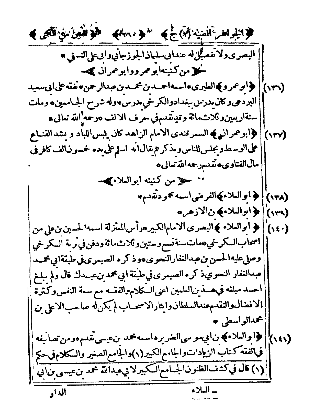 141 - أَبُو الْعَلَاء بن أبي مُوسَى الضَّرِير اسْمه مُحَمَّد بن عِيسَى تقدم وَمن تصانيفه فى الْفِقْه كتاب الزِّيَادَات وَالْجَامِع الْكَبِير وَالْجَامِع الصَّغِير وَالْكَلَام فى حكم