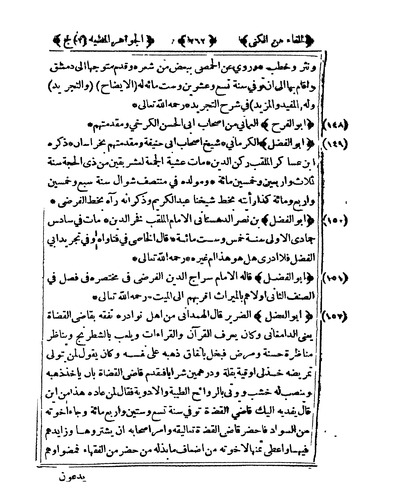 149 - أَبُو الْفضل الْكرْمَانِي شيخ أَصْحَاب أبي حنيفَة ومقدمتهم بخراسان ذكره أبن عَسَاكِر الملقب ركن الدّين مَاتَ عَشِيَّة الْجُمُعَة لعشر بَقينَ من ذِي الْحجَّة سنة ثَلَاث وَأَرْبَعين وَخمْس مائَة ومولده فى منتصف شَوَّال سنة سبع وَخمسين وَأَرْبع مائَة كَذَا رَأَيْته بِخَط شَيخنَا عبد الْكَرِيم وَذكر أَنه رَآهُ بِخَط الفرضي