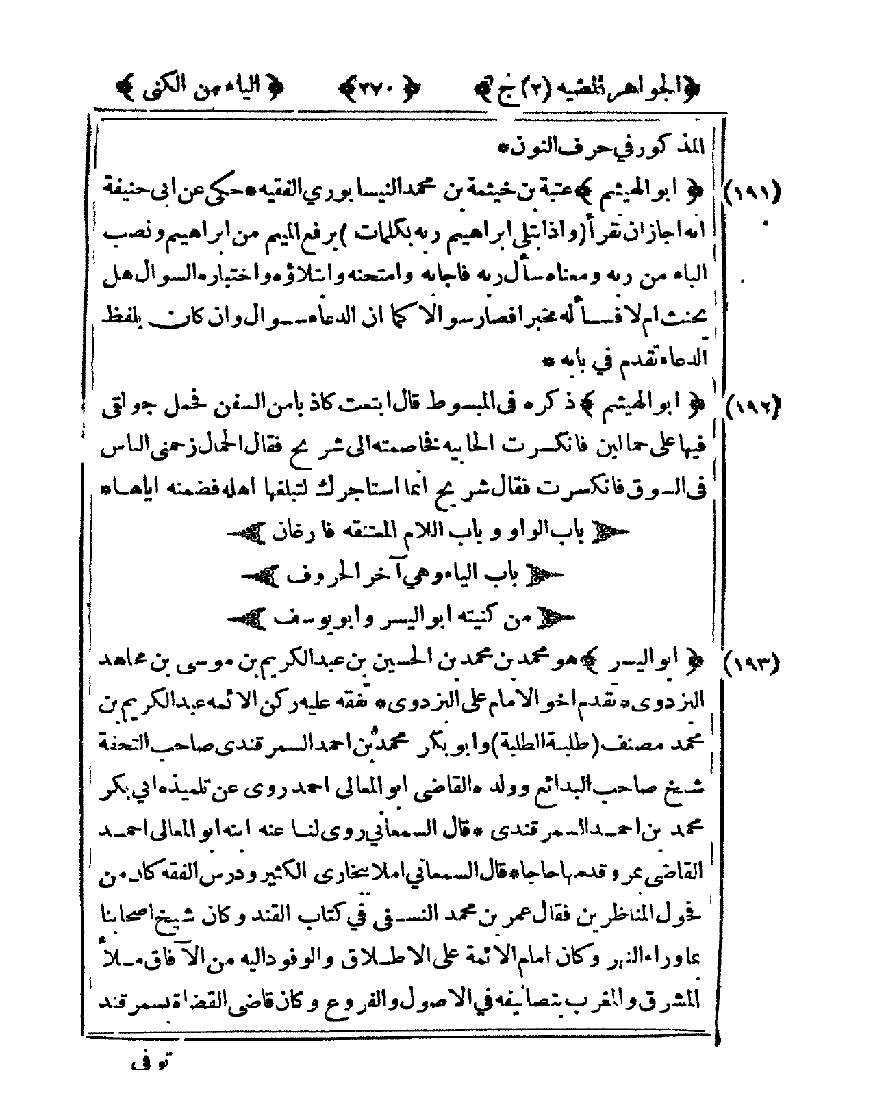 193 - أَبُو الْيُسْر هُوَ مُحَمَّد بن مُحَمَّد بن الْحُسَيْن بن عبد الْكَرِيم بن مُوسَى بن مُجَاهِد الْبَزْدَوِيّ تقدم أَخُو الإِمَام عَليّ الْبَزْدَوِيّ تفقه عَلَيْهِ ركن الْأَئِمَّة عبد الْكَرِيم بن مُحَمَّد مُصَنف طلبة الطّلبَة وَأَبُو بكر مُحَمَّد بن أَحْمد السَّمرقَنْدِي صَاحب التُّحْفَة شيخ صَاحب الْبَدَائِع وَولده القَاضِي أَبُو الْمَعَالِي أَحْمد روى عَن تِلْمِيذه أبي بكر مُحَمَّد بن أَحْمد السَّمرقَنْدِي قَالَ السَّمْعَانِيّ روى لنا عَنهُ ابْنه أَبُو الْمَعَالِي أَحْمد القَاضِي بمرو وقدمها حَاجا قَالَ السَّمْعَانِيّ أملا ببخارى الْكثير ودرس الْفِقْه كَانَ من فحول المناظرين فَقَالَ عمر بن مُحَمَّد النَّسَفِيّ فى كتاب القند وَكَانَ شيخ أَصْحَابنَا بِمَا وَرَاء النَّهر وَكَانَ إِمَام الْأَئِمَّة على الْإِطْلَاق والوفود إِلَيْهِ من الْآفَاق مَلأ الْمشرق وَالْمغْرب بتصانيفه فى الْأُصُول وَالْفُرُوع وَكَانَ قَاضِي الْقُضَاة بسمرقند