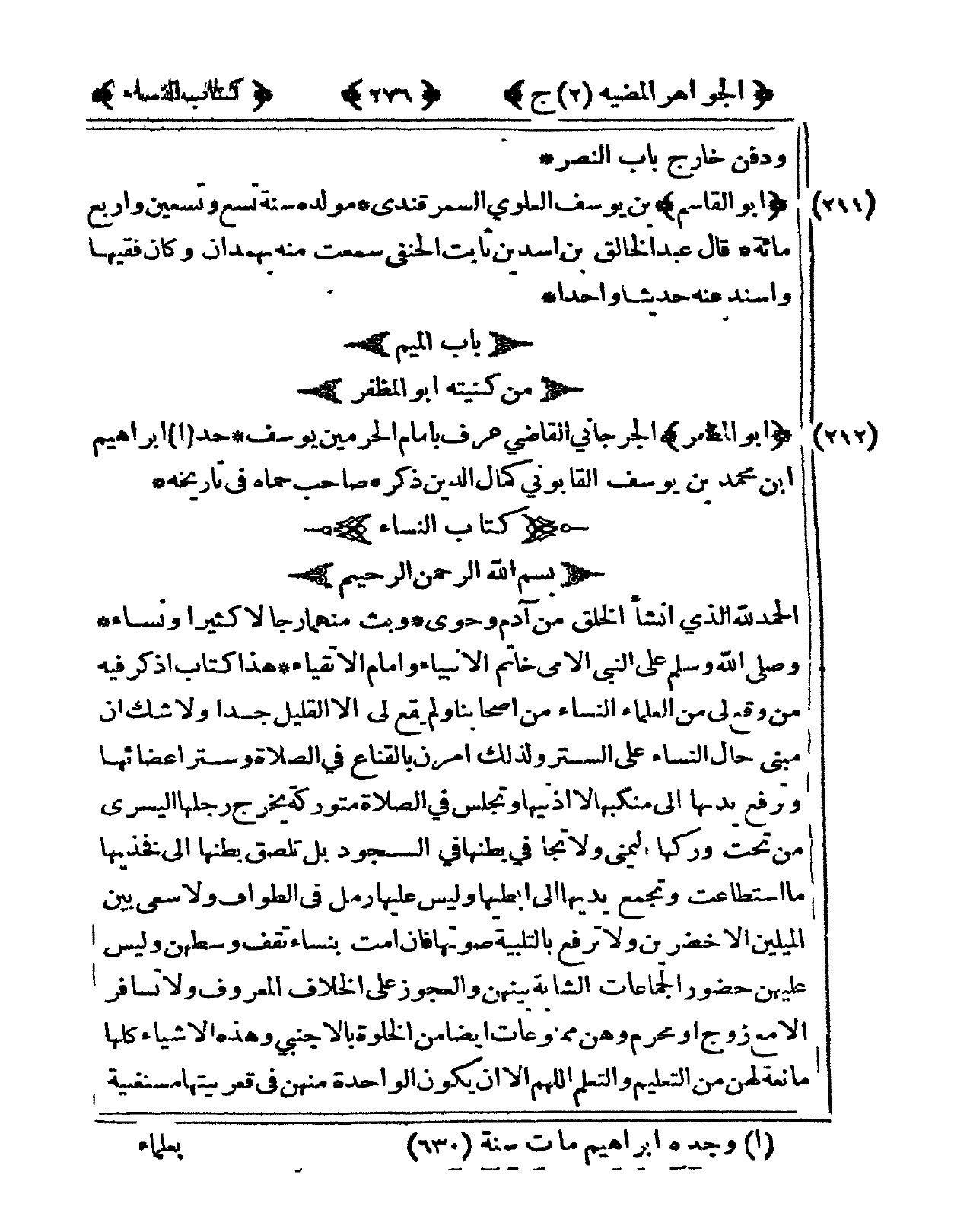 212 - أَبُو المظفر الْجِرْجَانِيّ القَاضِي عرف بِإِمَام الْحَرَمَيْنِ يُوسُف جد إِبْرَاهِيم ابْن مُحَمَّد بن يُوسُف القابوني كَمَال الدّين ذكره صَاحب حماه فى تَارِيخه = كتاب النِّسَاء = بِسم الله الرَّحْمَن الرَّحِيم