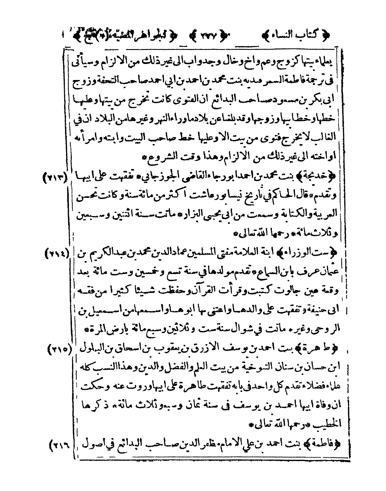 213 - خَدِيجَة بنت مُحَمَّد بن أَحْمد أَبُو رَجَاء القَاضِي الْجوزجَاني تفقهت على أَبِيهَا وَتقدم قَالَ الْحَاكِم فى تَارِيخ نيسابور عاشت أَكثر من مائَة سنة وَكَانَت تحسن الْعَرَبيَّة وَالْكِتَابَة وَسمعت من أبي يحيى الْبَزَّار مَاتَت سنة اثْنَتَيْنِ وَسبعين وَثَلَاث مائَة رَحمهَا الله تَعَالَى