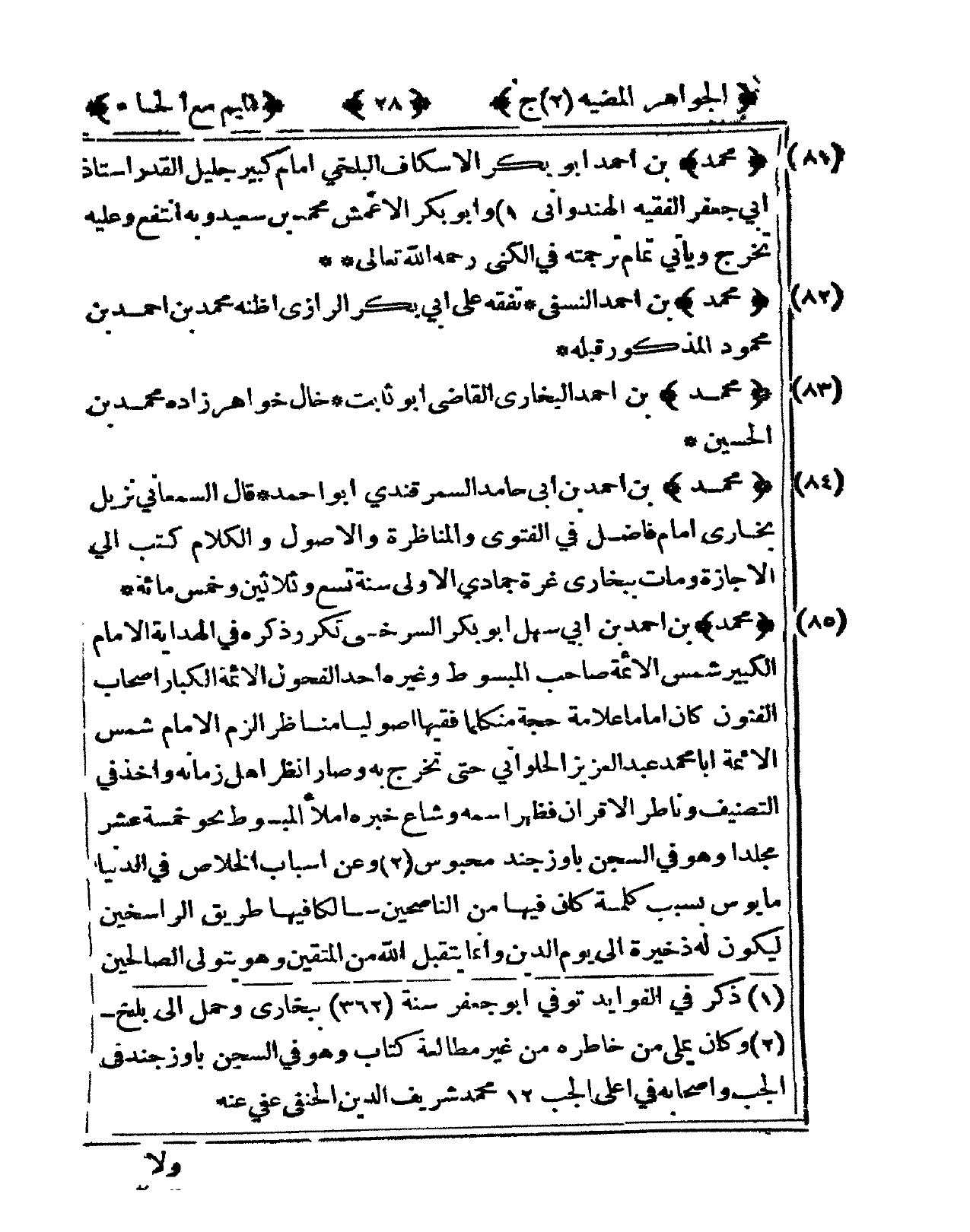 85 - مُحَمَّد بن أَحْمد بن أبي سهل أَبُو بكر السَّرخسِيّ تكَرر ذكره فى الْهِدَايَة الإِمَام الْكَبِير شمس الْأَئِمَّة صَاحب الْمَبْسُوط وَغَيره أحد الفحول الْأَئِمَّة الْكِبَار أَصْحَاب الْفُنُون كَانَ إِمَامًا عَلامَة حجَّة متكلما فَقِيها أصوليا مناظرا لزم الإِمَام شمس الْأَئِمَّة أَبَا مُحَمَّد عبد الْعَزِيز الْحلْوانِي حَتَّى تخرج بِهِ وَصَارَ أنظر أهل زَمَانه وَأخذ فى التصنيف وناظر الأقران فَظهر اسْمه وشاع خَبره أملأ الْمَبْسُوط نَحْو خسمة عشر مجلدا وَهُوَ فى السجْن بأوزجند مَحْبُوس وَعَن أَسبَاب الْخَلَاص فى الدُّنْيَا مأيوس بِسَبَب كلمة كَانَ فِيهَا من الناصحين سالكا فِيهَا طَرِيق الراسخين ليَكُون لَهُ ذخيرة إِلَى يَوْم الدّين وَإِنَّمَا يتَقَبَّل الله من الْمُتَّقِينَ وَهُوَ يتَوَلَّى الصَّالِحين