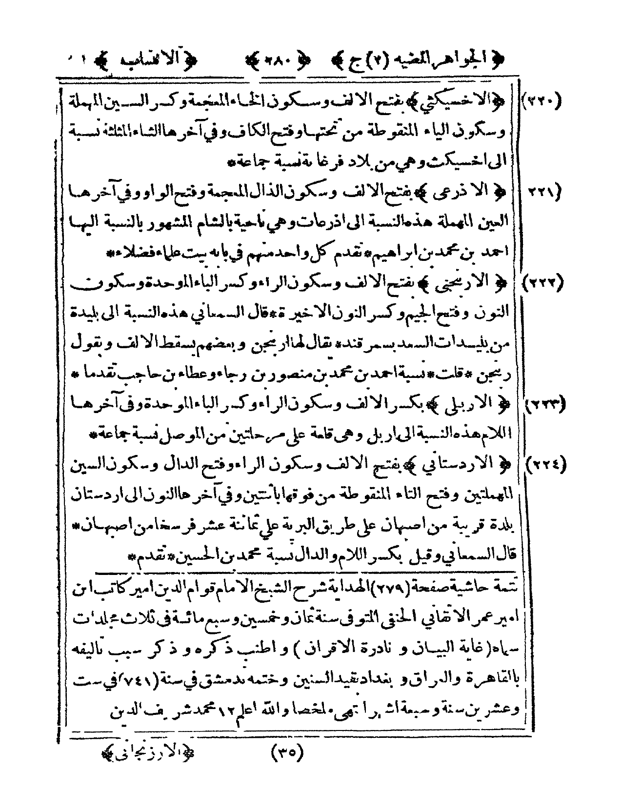 221 - الْأَذْرَعِيّ بِفَتْح الْألف وَسُكُون الذَّال الْمُعْجَمَة وَفتح الْوَاو وفى آخرهَا الْعين الْمُهْملَة هَذِه النِّسْبَة إِلَى أَذْرُعَات وهى نَاحيَة بِالشَّام الْمَشْهُور بِالنِّسْبَةِ إِلَيْهَا أَحْمد بن مُحَمَّد بن إِبْرَاهِيم تقدم كل وَاحِد مِنْهُم فى بَابه بَيت عُلَمَاء فضلاء