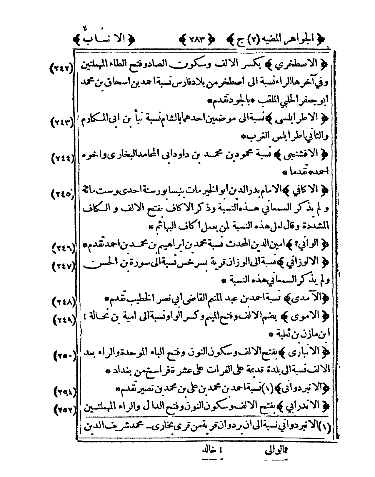 242 - الأصطخري بِكَسْر الْألف وَسُكُون الصَّاد وَفتح الطَّاء الْمُهْمَلَتَيْنِ وفى آخرهَا الرَّاء نِسْبَة إِلَى اصطخر من بِلَاد فَارس نِسْبَة أَحْمد بن إِسْحَاق بن مُحَمَّد أَبُو جَعْفَر الْحلَبِي الملقب بالجود تقدم