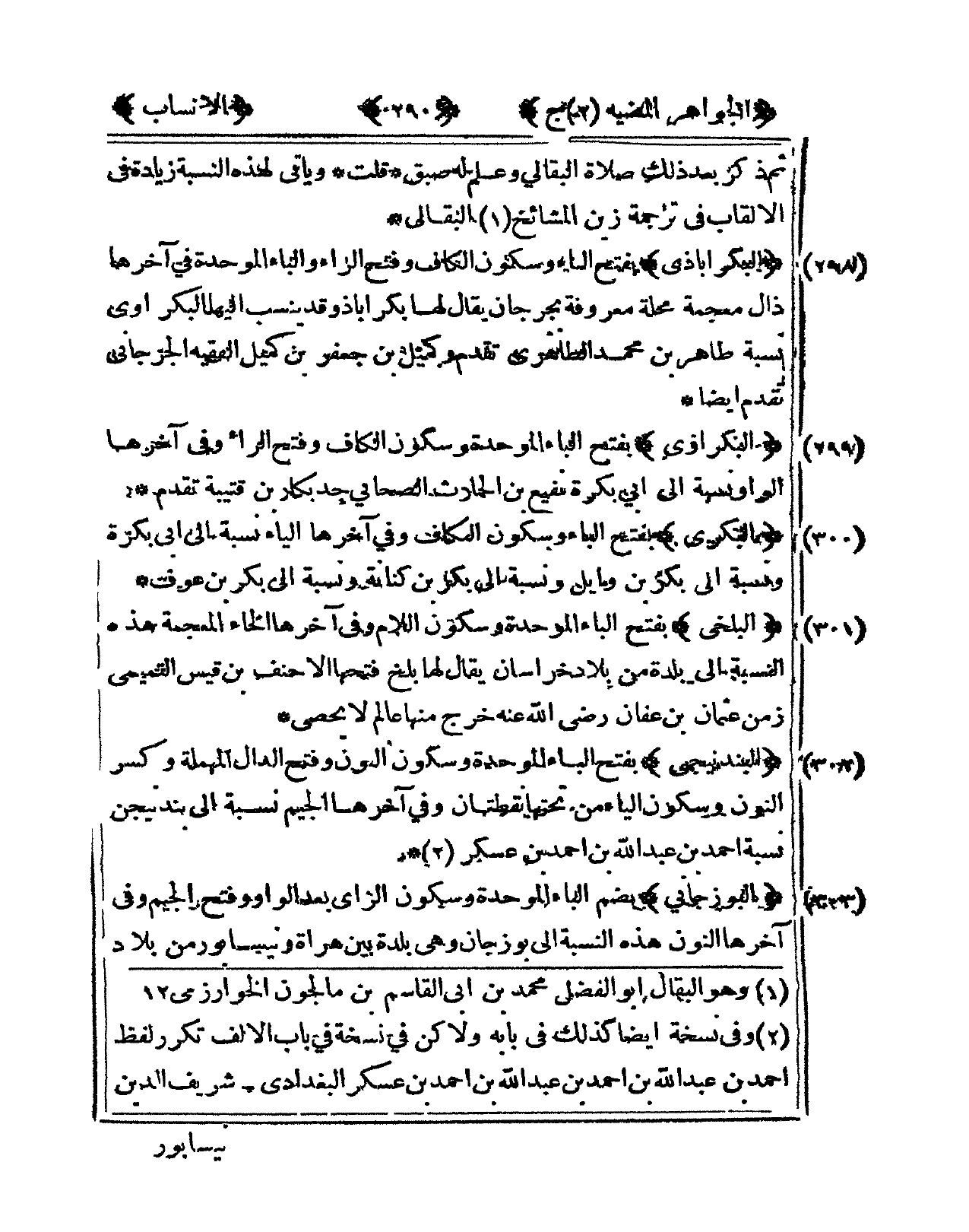 303 - البوزجاني بِضَم الْبَاء الْمُوَحدَة وَسُكُون الزَّاي بعد الْوَاو وَفتح الْجِيم وَفِي آخرهَا النُّون هَذِه النِّسْبَة إِلَى بوزجان وهى بَلْدَة بَين هراة ونيسابور من بِلَاد