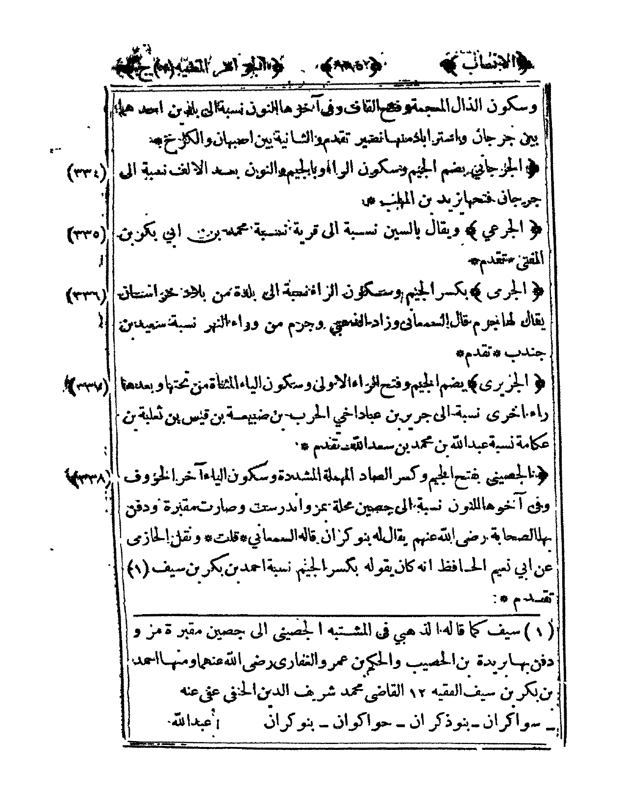 334 - الْجِرْجَانِيّ بِضَم الْجِيم وَسُكُون الرَّاء وبالجيم وَالنُّون بعد الْألف نِسْبَة إِلَى جرجان فتحهَا يزِيد بن الْمُهلب