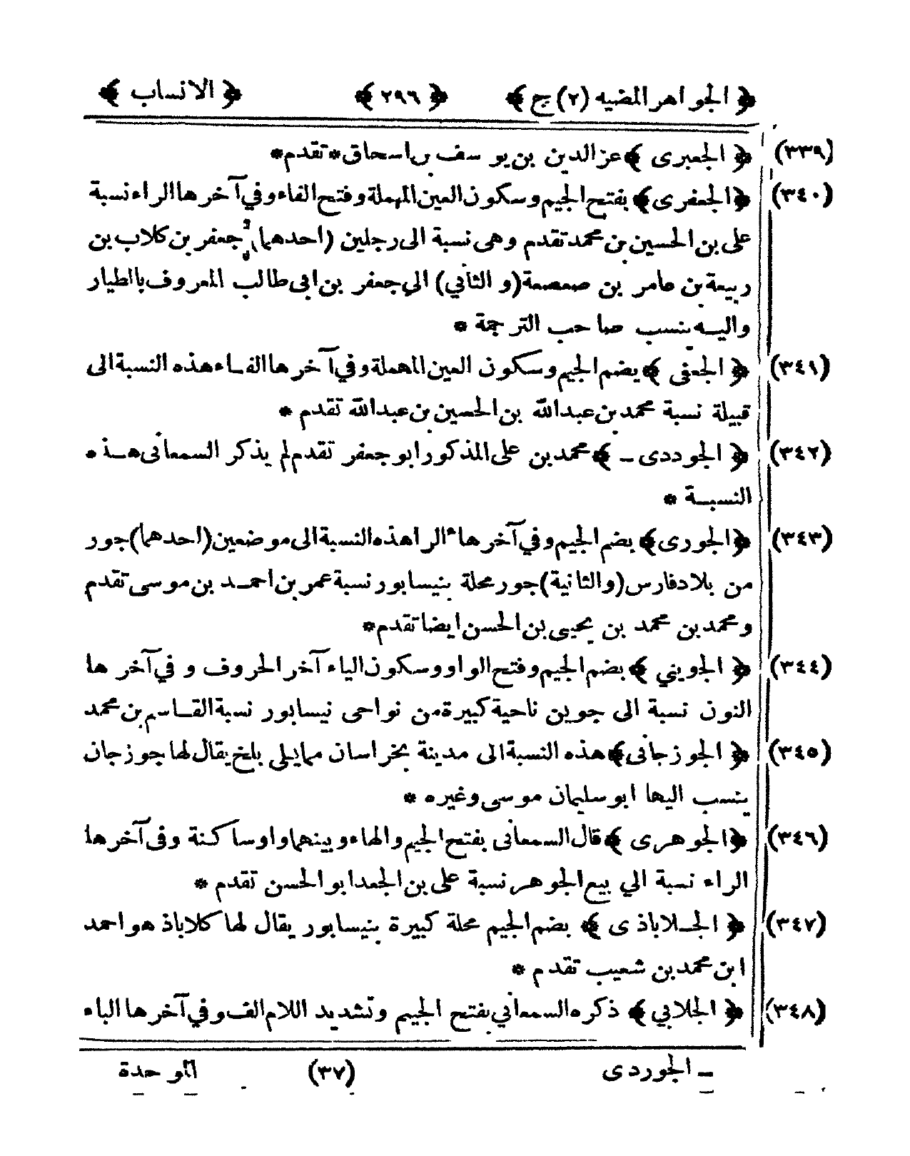 346 - الْجَوْهَرِي قَالَ السَّمْعَانِيّ بِفَتْح الْجِيم وَالْهَاء وَبَينهمَا وَاو سَاكِنة وفى آخرهَا الرَّاء نِسْبَة إِلَى بيع الْجَوْهَر نِسْبَة عَليّ بن الْجَعْد أَبُو الْحسن تقدم
