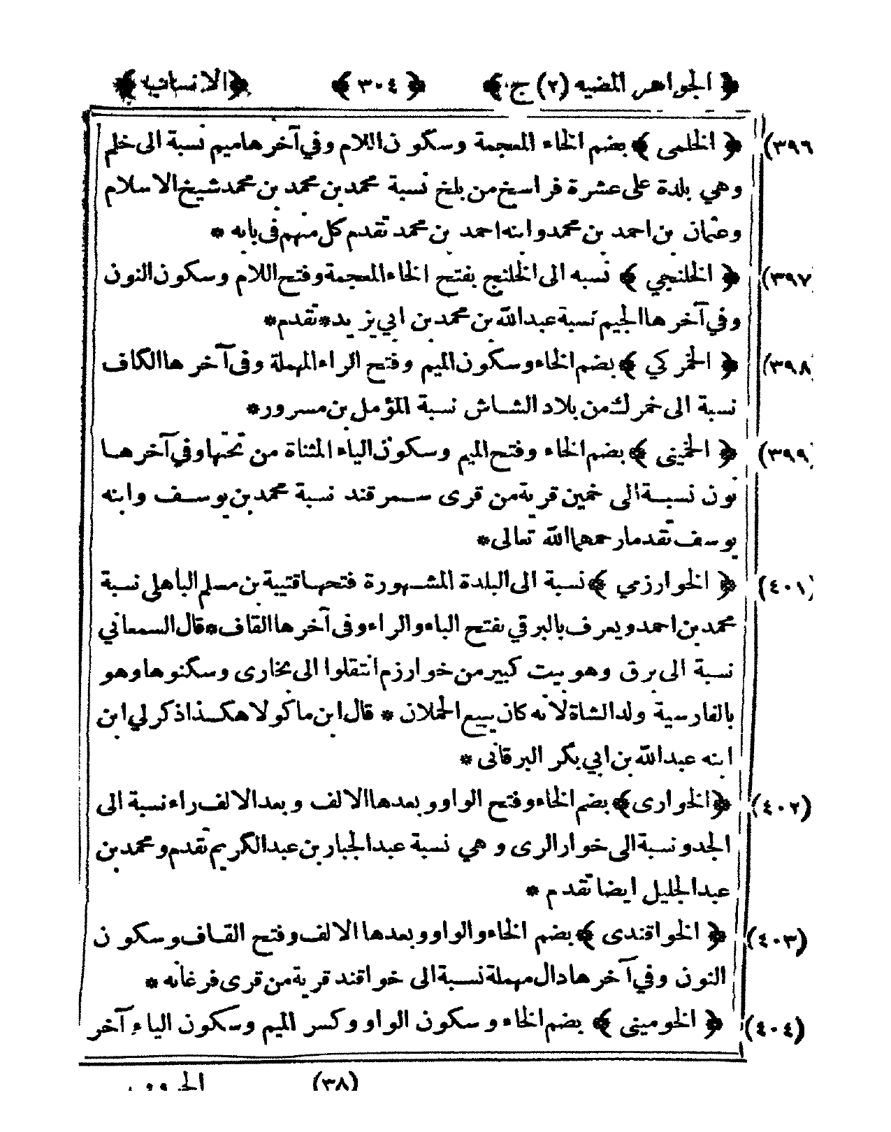 403 - الخواقندي بِضَم الْخَاء وَالْوَاو وَبعدهَا الْألف وَفتح الْقَاف وَسُكُون النُّون وفى آخرهَا دَال مُهْملَة نِسْبَة إِلَى خواقند قَرْيَة من قرى فرغانه