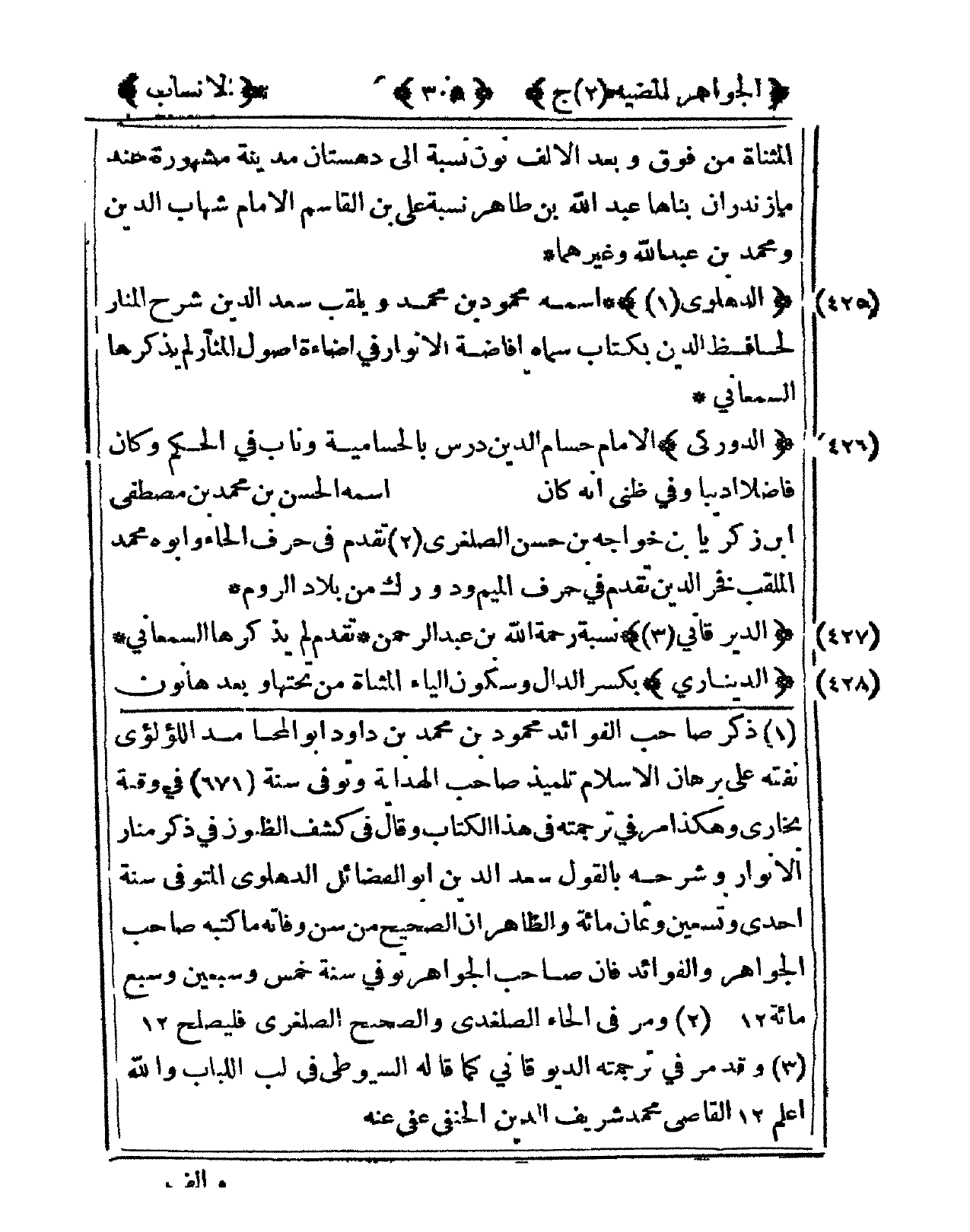 425 - الدهلوي اسْمه مَحْمُود بن مُحَمَّد ويلقب سعد الدّين شرح الْمنَار لحافظ الدّين بِكِتَاب سَمَّاهُ افاضة الْأَنْوَار فى اضاءة أصُول الْمنَار لم يذكرهَا السَّمْعَانِيّ