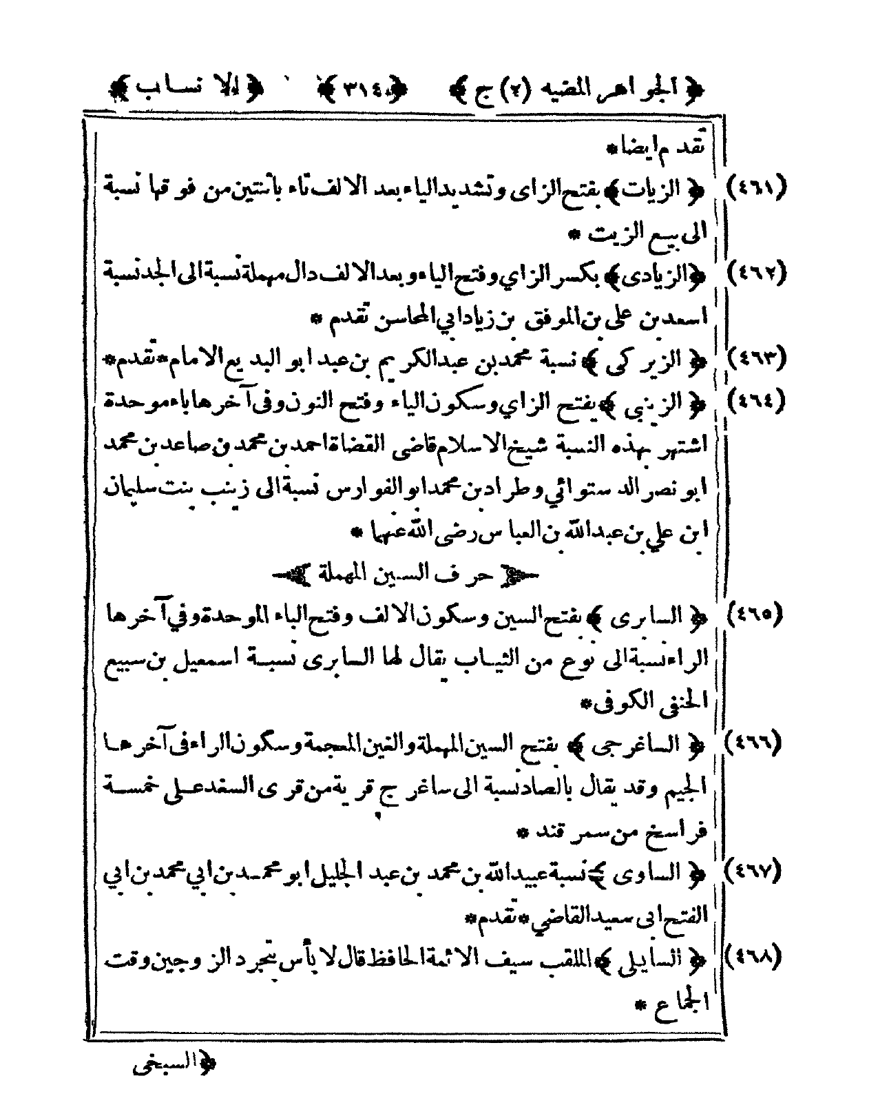 466 - الساغرجي بِفَتْح السِّين الْمُهْملَة والغين الْمُعْجَمَة وَسُكُون الرَّاء فى آخرهَا الْجِيم وَقد يُقَال بالصَّاد نِسْبَة إِلَى ساغرج قَرْيَة من قرى السغد عَليّ خَمْسَة فراسخ من سَمَرْقَنْد