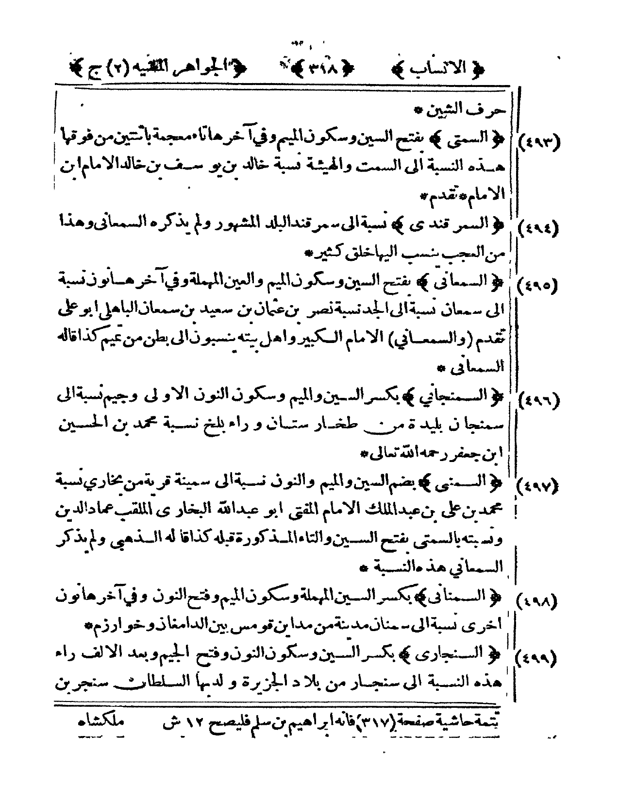 495 - السَّمْعَانِيّ بِفَتْح السِّين وَسُكُون الْمِيم وَالْعين الْمُهْملَة وفى آخرهَا نون نِسْبَة إِلَى سمْعَان نِسْبَة إِلَى الْجد نِسْبَة نصر بن عُثْمَان بن سعيد بن سمْعَان الْبَاهِلِيّ أَبُو عَليّ تقدم والسمعاني الإِمَام الْكَبِير وَأهل بَيته ينسبون إِلَى بطن من تَمِيم كَذَا قَالَه السَّمْعَانِيّ