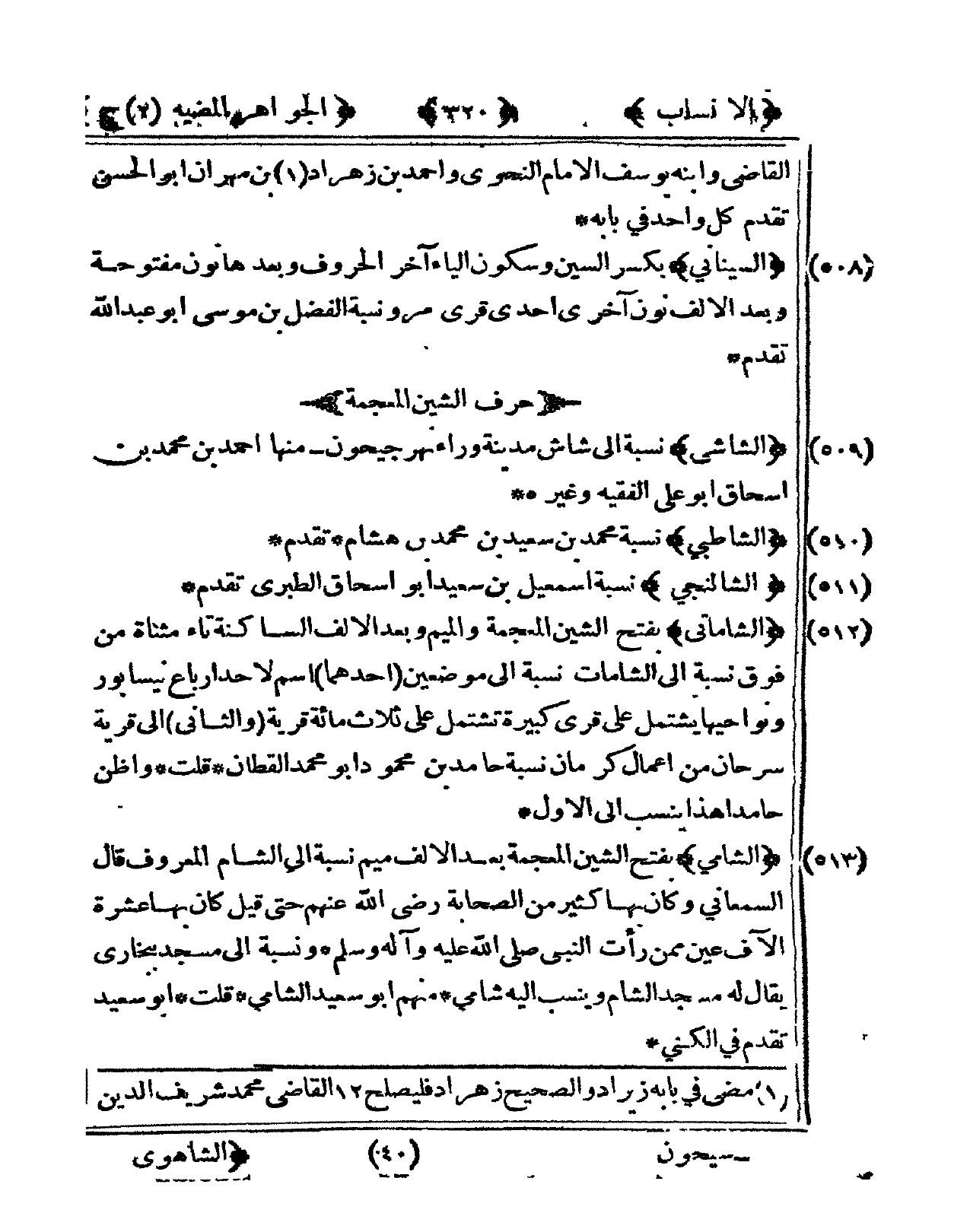 513 - الشَّامي بِفَتْح الشين الْمُعْجَمَة بعد الْألف مِيم نِسْبَة إِلَى الشَّام الْمَعْرُوف قَالَ السَّمْعَانِيّ وَكَانَ بهَا كثير من الصَّحَابَة رَضِي الله عَنْهُم حَتَّى قيل كَانَ بهَا عشرَة الآف عين مِمَّن رَأَتْ النَّبِي صلى الله عَلَيْهِ وَسلم وَنسبَة إِلَى مَسْجِد ببخارى يُقَال لَهُ مَسْجِد الشَّام وينسب إِلَيْهِ شَامي مِنْهُم أَبُو سعيد الشَّامي قلت أَبُو سعيد تقدم فى الكنى