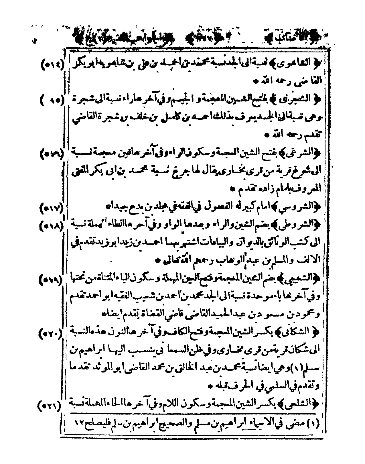 516 - الشرغي بِفَتْح الشين الْمُعْجَمَة وَسُكُون الرَّاء وفى آخرهَا غين مُعْجمَة نِسْبَة إِلَى شرغ قَرْيَة من قرى بُخَارى يُقَال لَهَا جرغ نِسْبَة مُحَمَّد بن أبي بكر الْمُفْتِي الْمَعْرُوف بِإِمَام زَاده تقدم