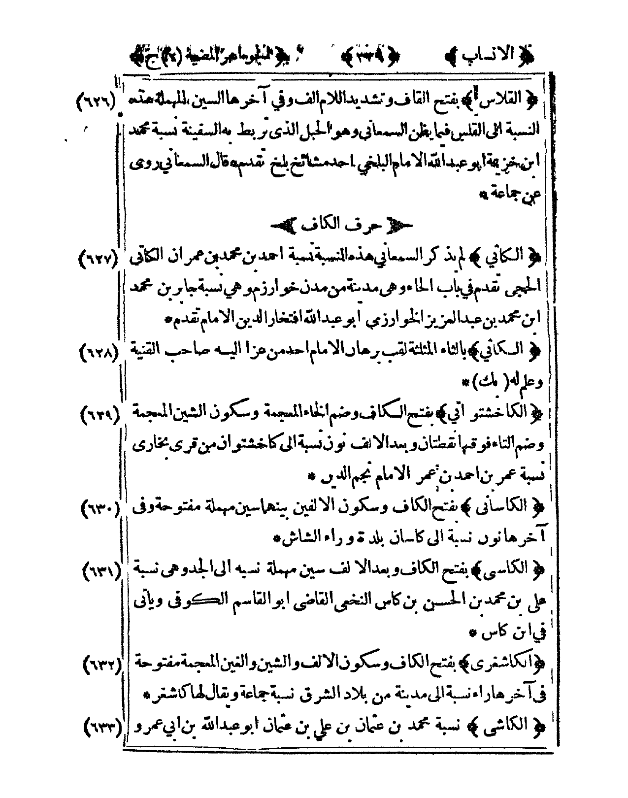 630 - الكاساني بِفَتْح الْكَاف وَسُكُون الْأَلفَيْنِ بَينهمَا سين مُهْملَة مَفْتُوحَة وفى آخرهَا نون نِسْبَة إِلَى كاسان بَلْدَة وَرَاء الشاش