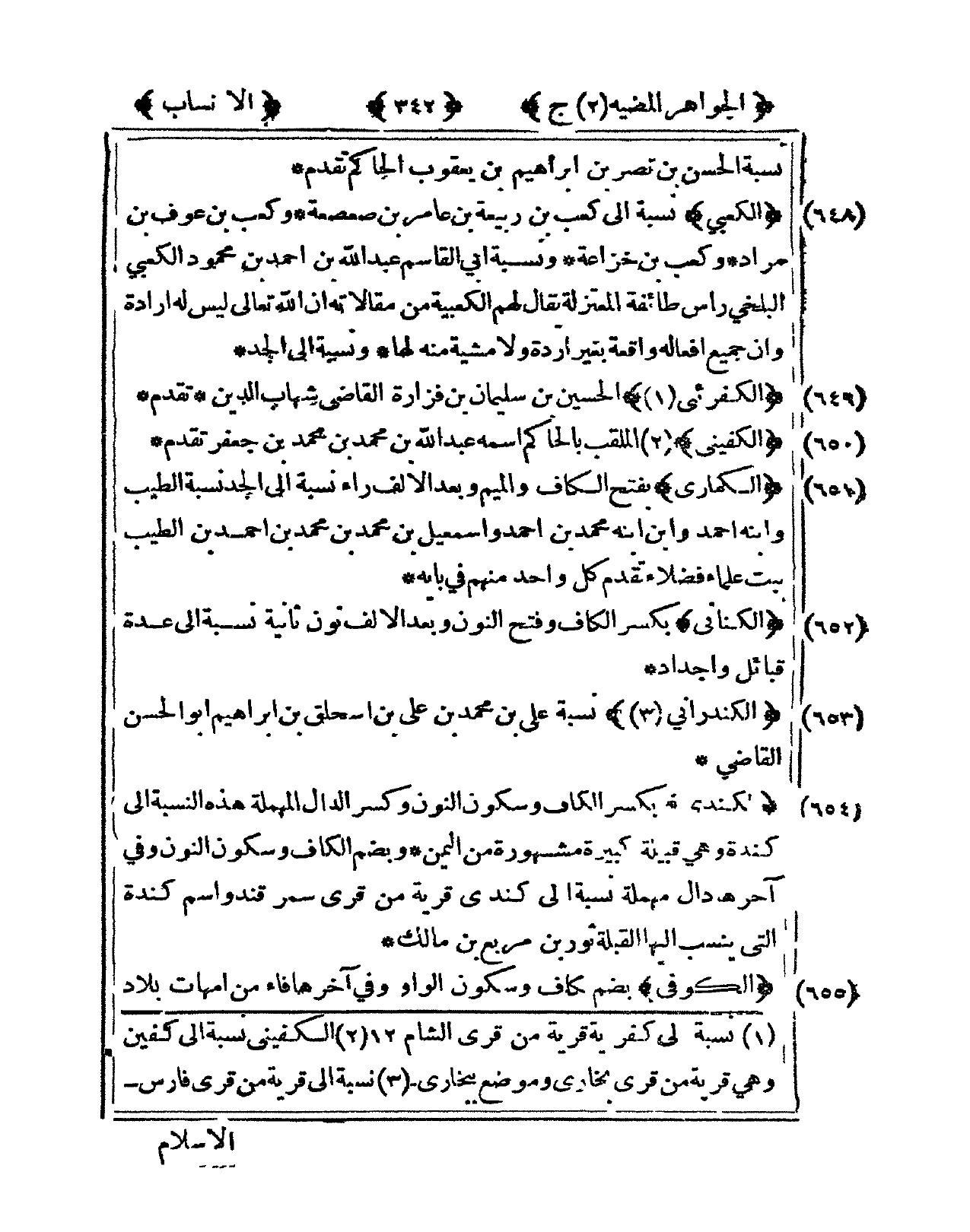 654 - الْكِنْدِيّ بِكَسْر الْكَاف وَسُكُون النُّون وَكسر الدَّال الْمُهْملَة هَذِه النِّسْبَة إِلَى كِنْدَة وهى قَبيلَة كَبِيرَة مَشْهُورَة من الْيمن وبضم الْكَاف وَسُكُون النُّون وفى آخرهَا دَال مُهْملَة نِسْبَة إِلَى كندي قَرْيَة من قرى سَمَرْقَنْد وَاسم كِنْدَة الَّتِى ينْسب إِلَيْهَا الْقبْلَة ثَوْر بن مربع بن مَالك