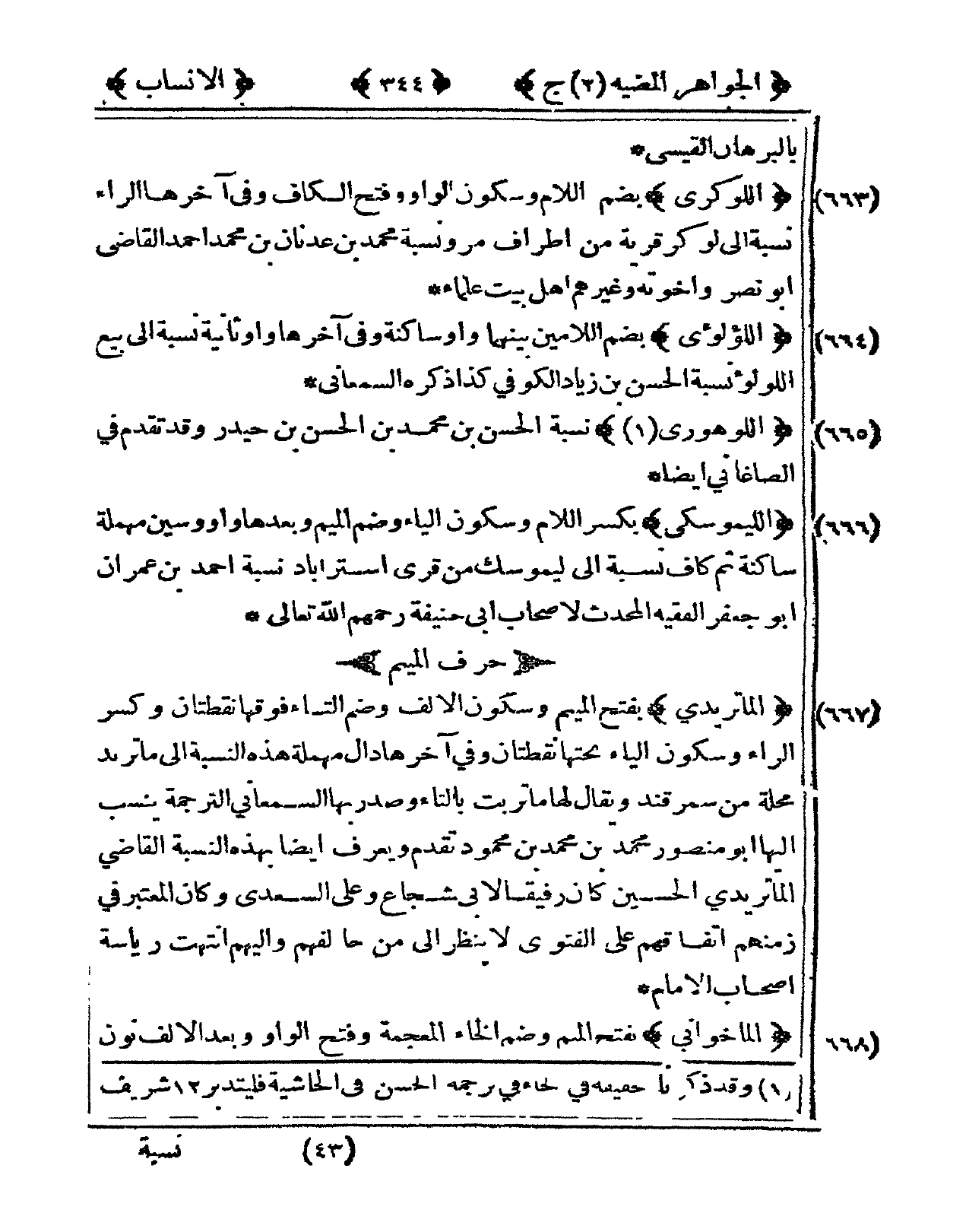 666 - الليموسكي بِكَسْر اللَّام وَسُكُون الْيَاء وَضم الْمِيم وَبعدهَا وَاو وسين مُهْملَة سَاكِنة ثمَّ كَاف نِسْبَة إِلَى ليموسك من قرى إسترأباد نِسْبَة أَحْمد بن عمرَان أَبُو جَعْفَر الْفَقِيه الْمُحدث لأَصْحَاب أبي حنيفَة رَحِمهم الله تَعَالَى