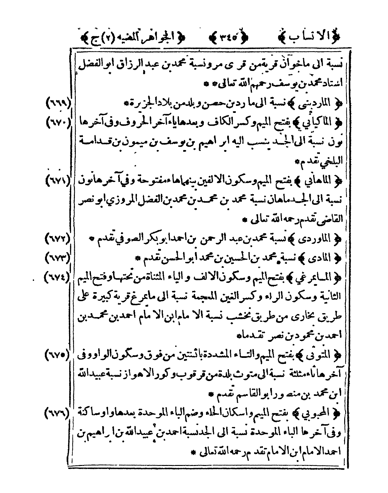 676 - المحبوبي بِفَتْح الْمِيم واسكان الْحَاء وَضم الْبَاء الْمُوَحدَة بعْدهَا وَاو سَاكِنة وفى آخرهَا الْبَاء الْمُوَحدَة نِسْبَة إِلَى الْجد نِسْبَة أَحْمد بن عبيد الله بن إِبْرَاهِيم بن أَحْمد الإِمَام ابْن الإِمَام تقدم رَحمَه الله تَعَالَى