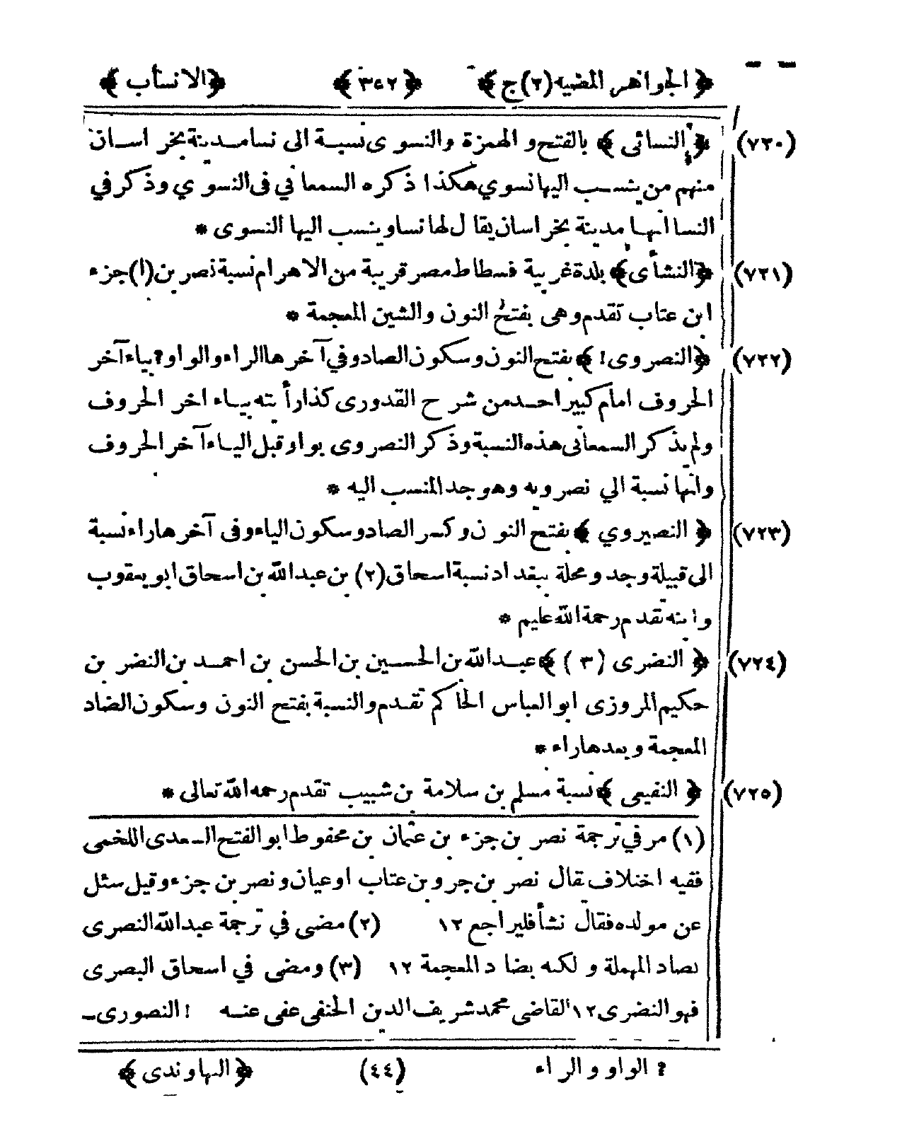 720 - النَّسَائِيّ بِالْفَتْح والهمزة والنسوي نِسْبَة إِلَى نسا مَدِينَة بخراسان مِنْهُم من ينْسب إِلَيْهَا نسوي هَكَذَا ذكره السَّمْعَانِيّ فى النسوي وَذكر فى النسا أَنَّهَا مَدِينَة بخراسان يُقَال لَهَا نسا وينسب إِلَيْهَا النسوي