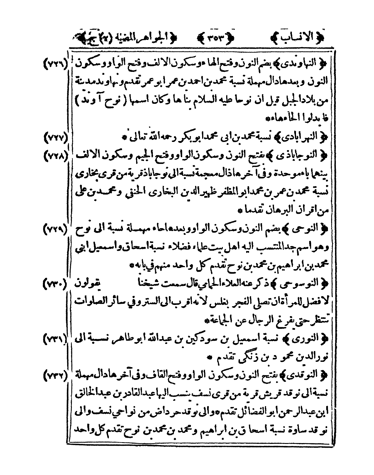 729 - النوحي بِضَم النُّون وَسُكُون الْوَاو وَبعدهَا حاء مُهْملَة نِسْبَة إِلَى نوح وَهُوَ اسْم جد المنتسب إِلَيْهِ أهل بَيت عُلَمَاء فضلاء نِسْبَة إِسْحَاق وإسمعيل ابنى مُحَمَّد بن إِبْرَاهِيم بن مُحَمَّد بن نوح تقدم كل وَاحِد مِنْهُم فى بَابه