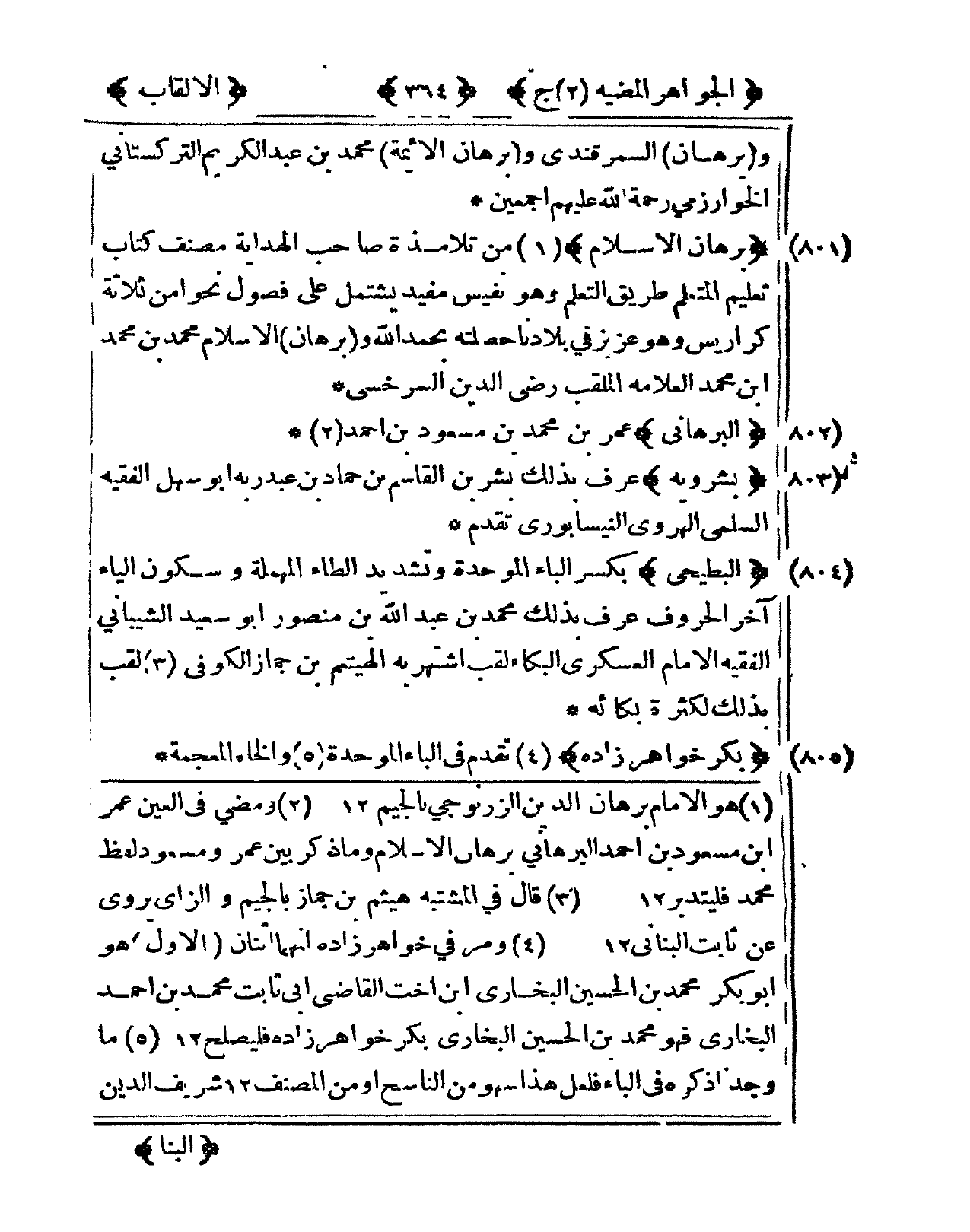 801 - برهَان الْإِسْلَام من تلامذة صَاحب الْهِدَايَة مُصَنف كتاب تَعْلِيم المتعلم طَرِيق التَّعَلُّم وَهُوَ نَفِيس مُفِيد يشْتَمل على فُصُول نَحوا من ثَلَاثَة كراريس وَهُوَ عَزِيز فى بِلَادنَا حصلته بِحَمْد الله وبرهان الْإِسْلَام مُحَمَّد بن مُحَمَّد ابْن مُحَمَّد الْعَلامَة الملقب رَضِي الدّين السَّرخسِيّ