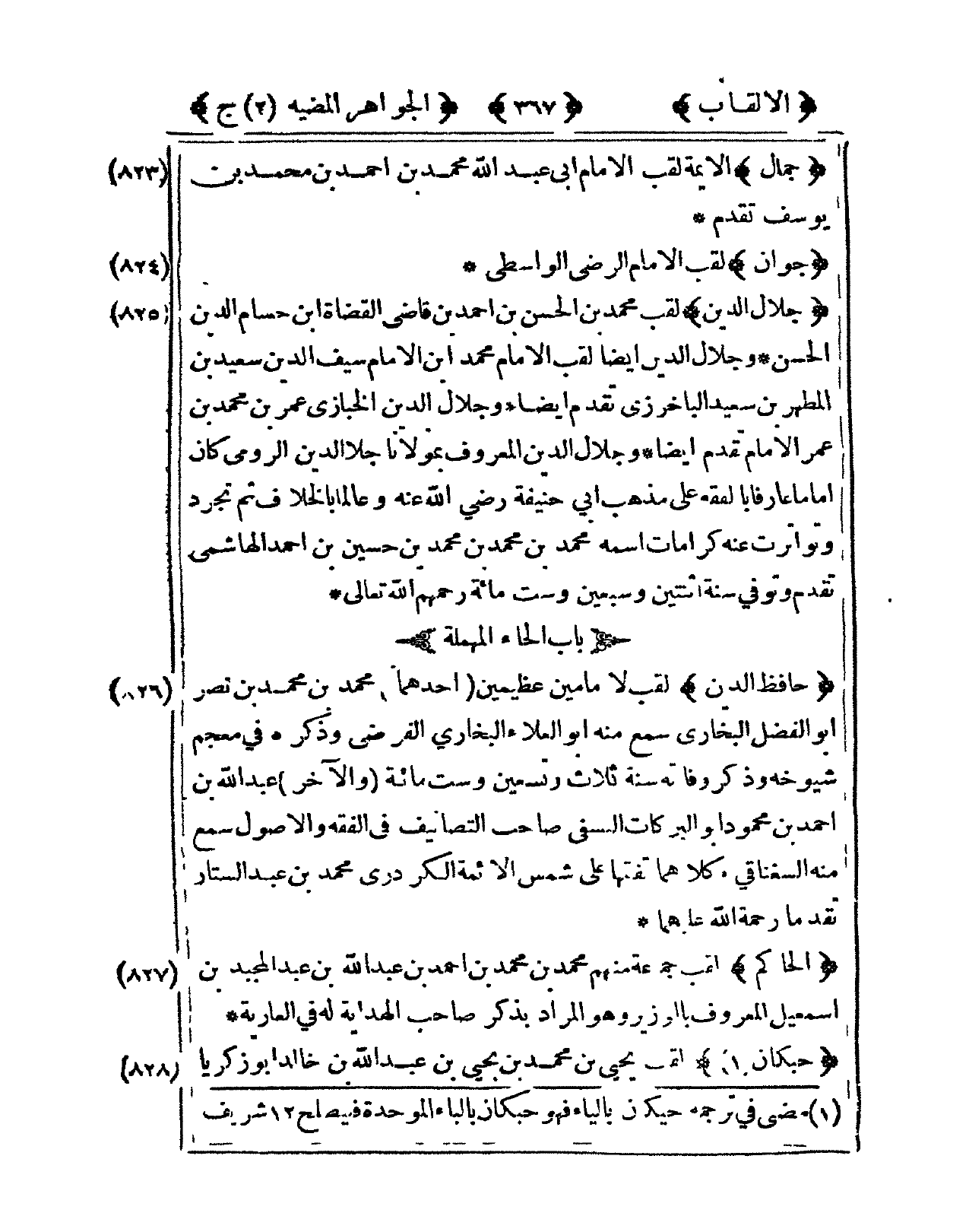 825 - جلال الدّين لقب مُحَمَّد بن الْحسن بن أَحْمد بن قَاضِي الْقُضَاة ابْن حسام الدّين الْحسن وجلال الدّين أَيْضا لقب الإِمَام مُحَمَّد ابْن الإِمَام سيف الدّين سعيد بن المطهر بن سعيد الباخرزي تقدم أَيْضا وجلال الدّين الْخَبَّازِي عمر بن مُحَمَّد بن عمر الإِمَام تقدم أَيْضا وجلال الدّين الْمَعْرُوف بمولانا جلال الدّين الرُّومِي كَانَ إِمَامًا عَارِفًا بالفقه على مَذْهَب أبي حنيفَة رَضِي الله عَنهُ وعالما بِالْخِلَافِ ثمَّ تجرد وتواترت عَنهُ كرامات اسْمه مُحَمَّد بن مُحَمَّد بن مُحَمَّد بن حُسَيْن بن أَحْمد الْهَاشِمِي تقدم وَتُوفِّي سنة اثْنَتَيْنِ وَسبعين وست مائَة رَحِمهم الله تَعَالَى