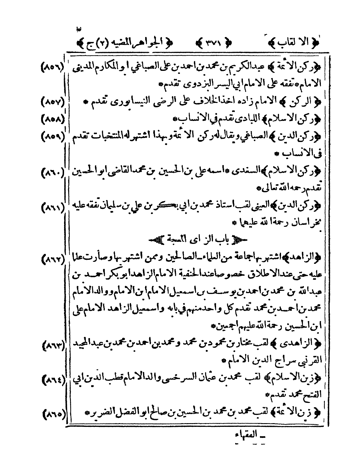 856 - ركن الْأَئِمَّة عبد الْكَرِيم بن مُحَمَّد بن أَحْمد بن عَليّ الصباغي أَبُو المكارم الْمَدِينِيّ الإِمَام تفقه على الإِمَام أبي الْيُسْر الْبَزْدَوِيّ تقدم